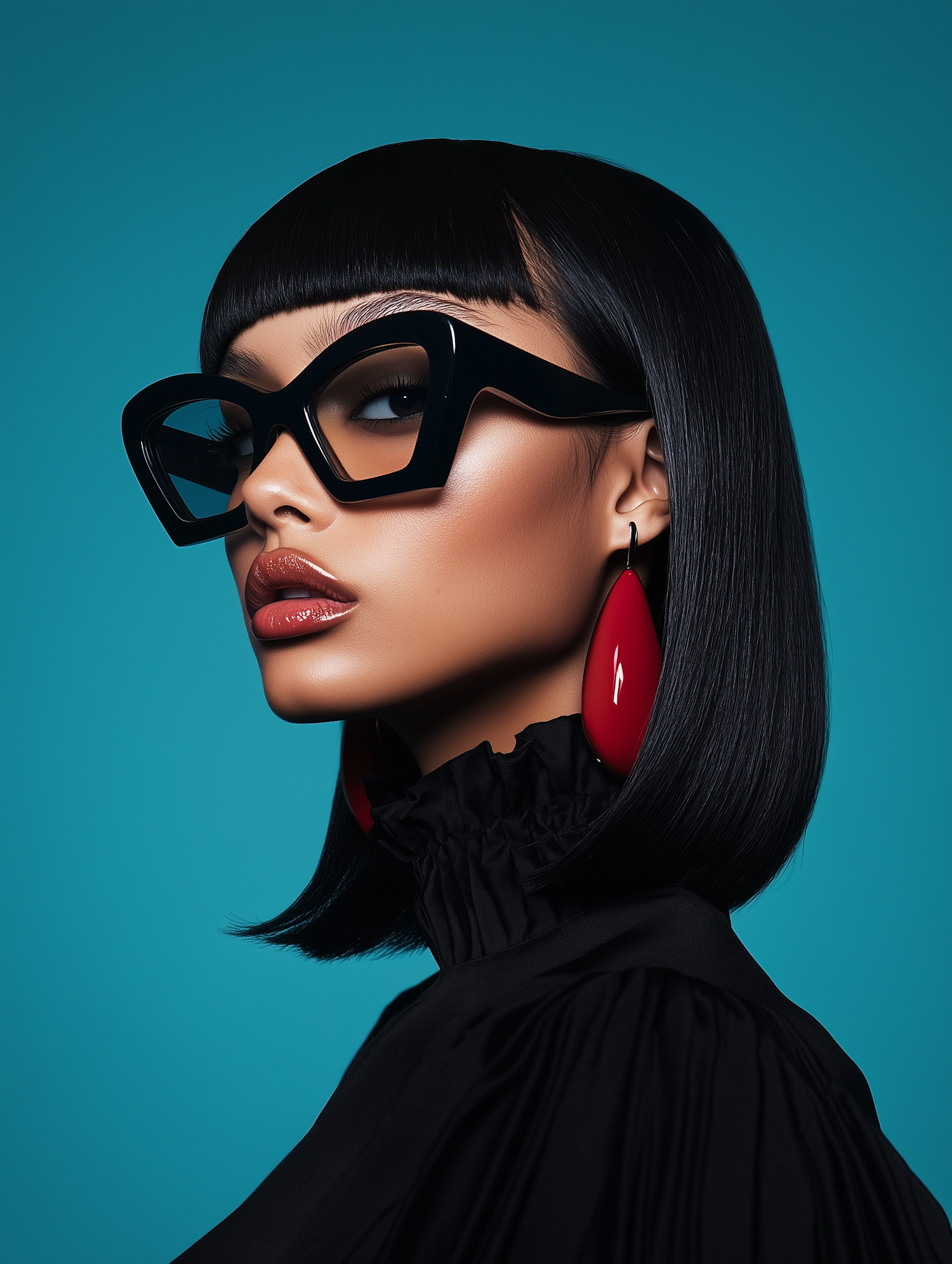 Stylish woman with sleek black bob, bold black glasses, and red earrings against a teal background. A modern and edgy fashion portrait.