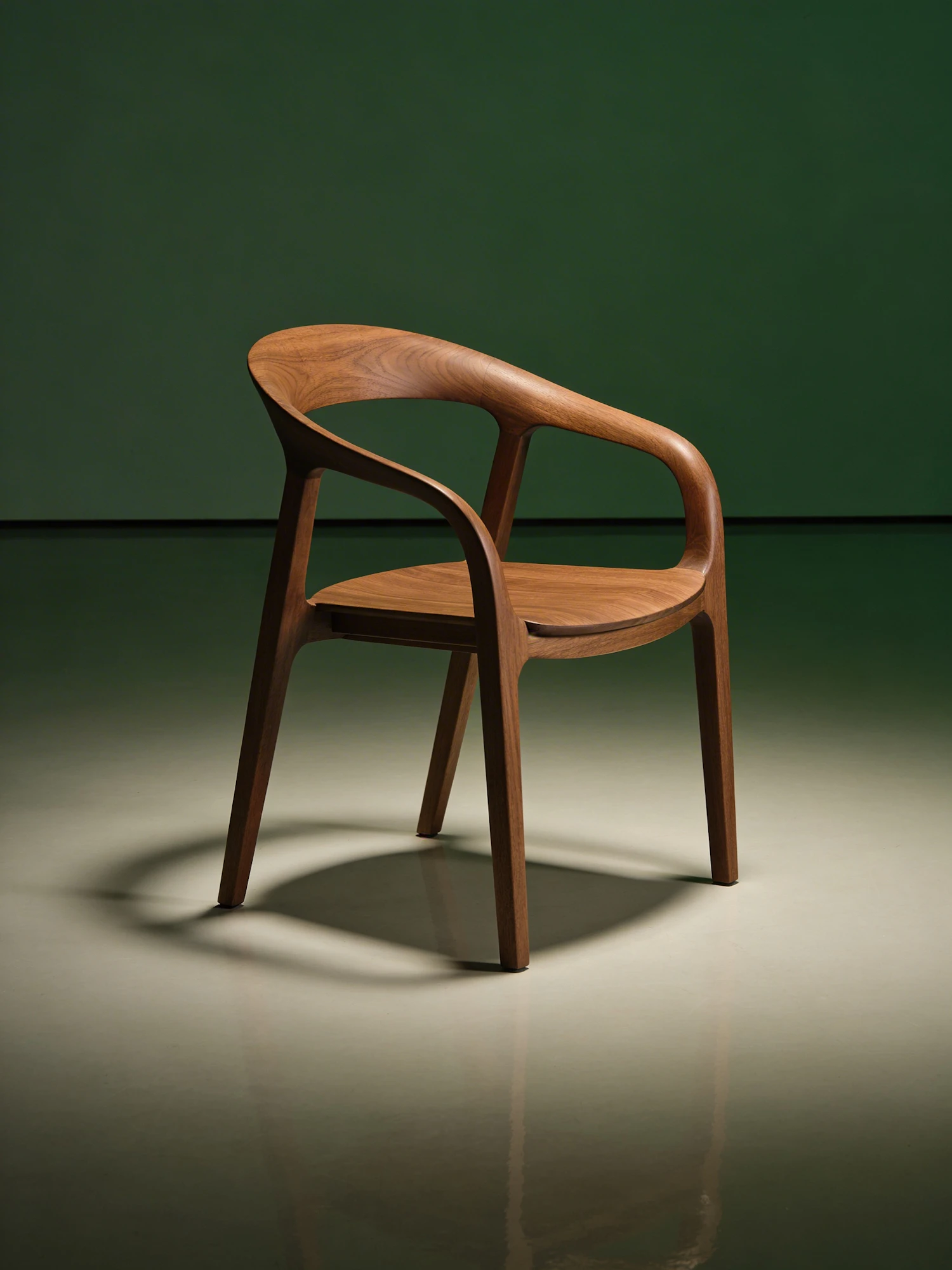 A sleek wooden chair with a curved backrest and armrests, set against a green background with soft lighting highlighting its design.