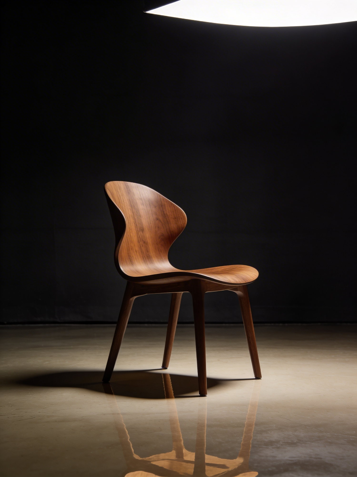 A modern wooden chair with a curved design under a spotlight, showcasing its polished finish and natural wood grain.