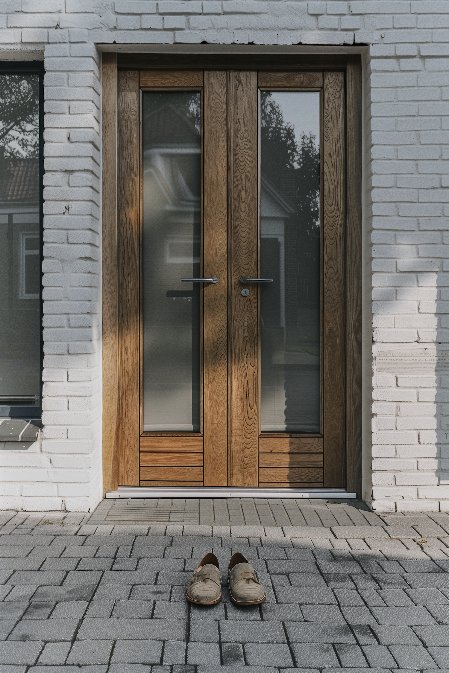 Beige slip-on shoes on a gray brick path in front of a wooden double door with white brick walls, reflecting a serene residential setting.