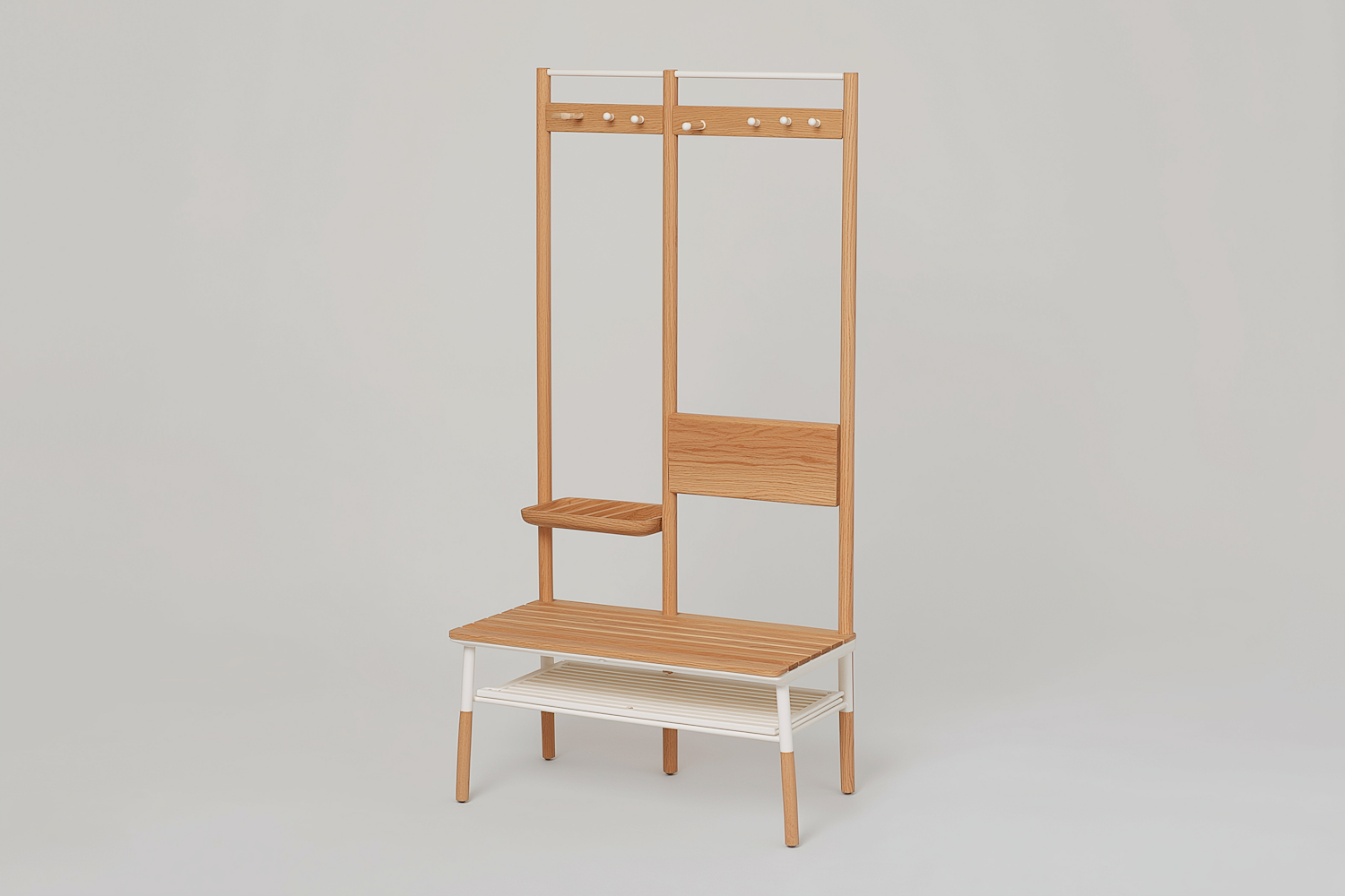 Minimalist wooden hall tree with a bench, hooks, and a shelf, perfect for organizing entryways with a modern touch.
