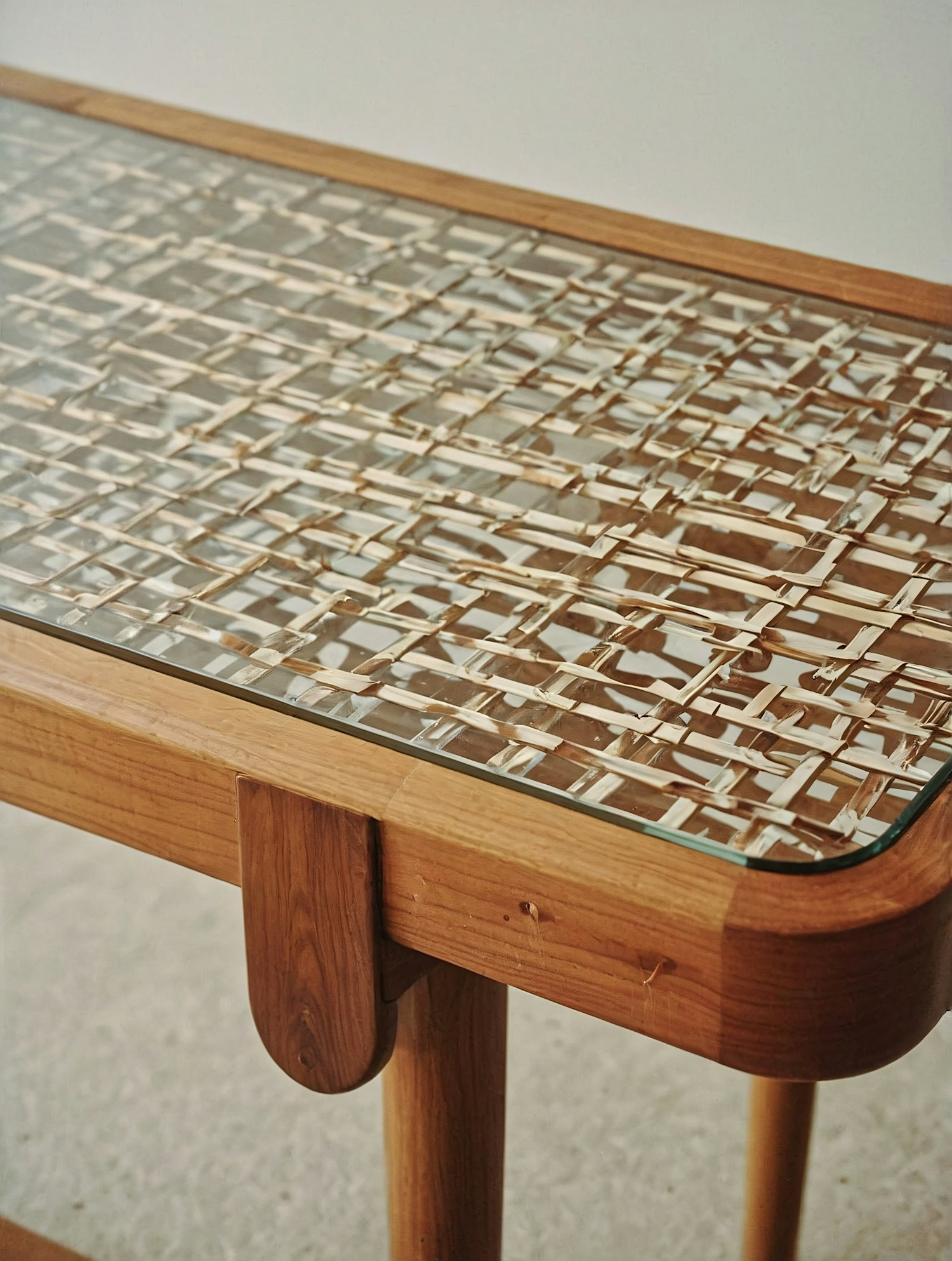 Modern wooden table with a glass top featuring a woven pattern, rounded edges, and cylindrical legs for a sleek, minimalist design.