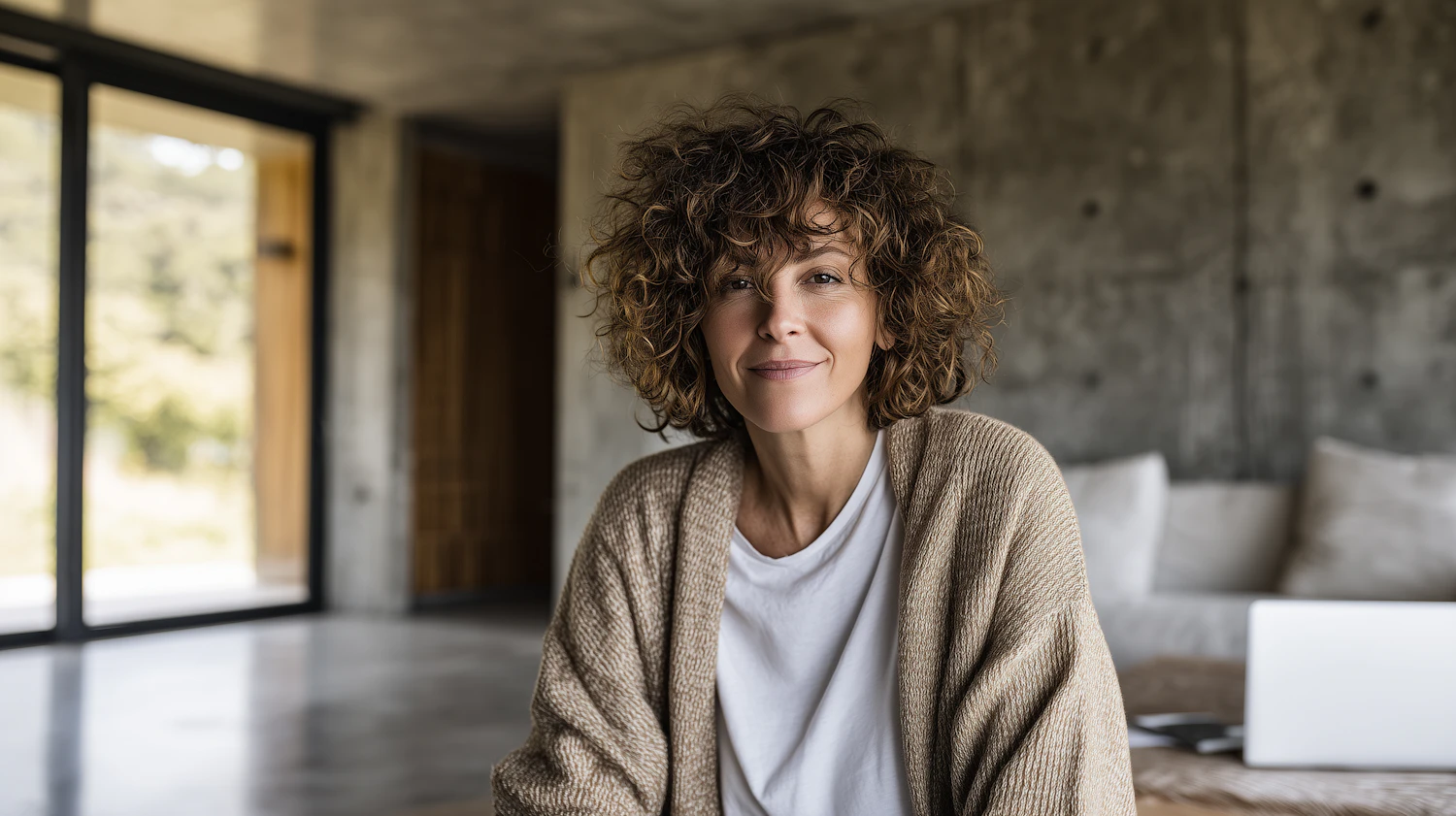 A woman with curly hair in a cozy cardigan sits in a modern room with natural light, exuding a relaxed and approachable vibe.