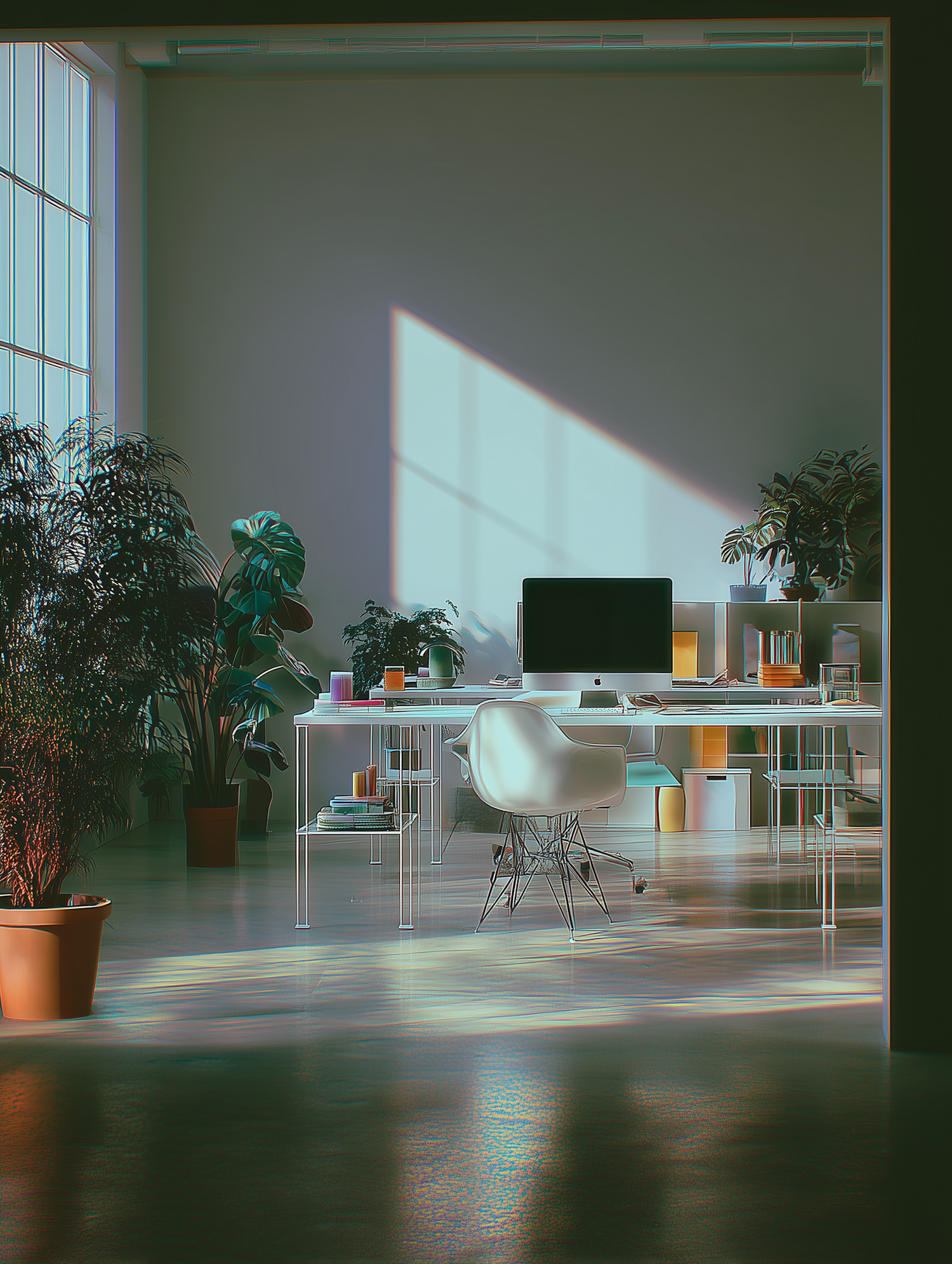A modern, sunlit workspace with a white desk, ergonomic chair, computer, and lush green plants, creating a serene and productive environment.
