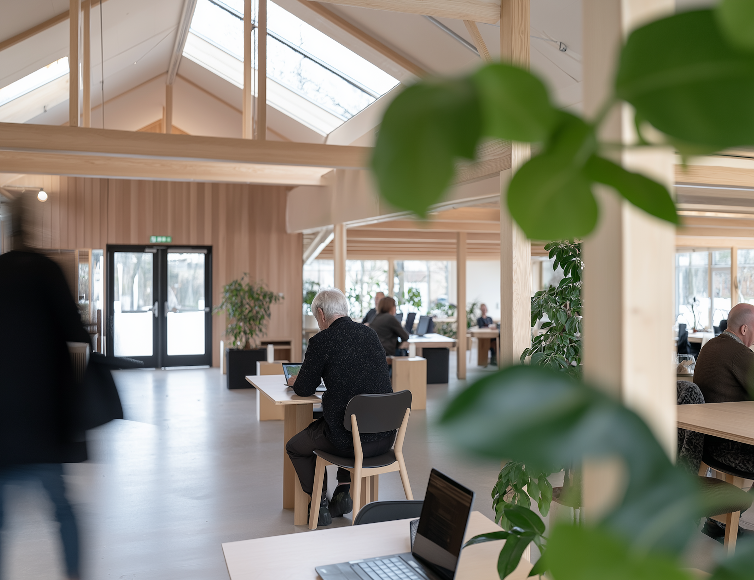 Bright open workspace with skylights, wooden interiors, and greenery. People working at tables create a calm, productive atmosphere.