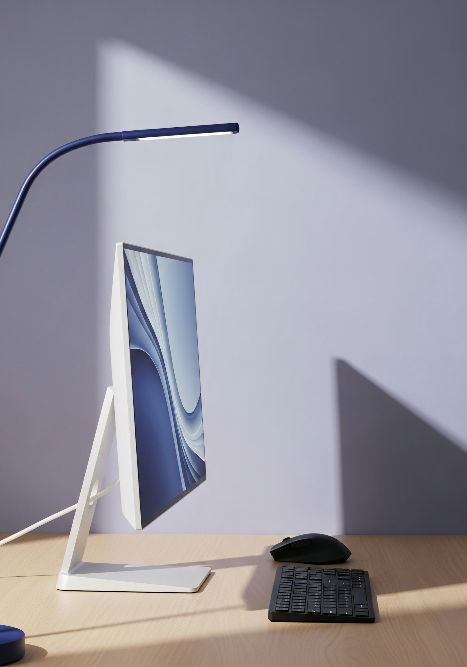 Minimalist workspace with a sleek monitor, black keyboard and mouse, and a modern blue desk lamp on a light wooden desk.