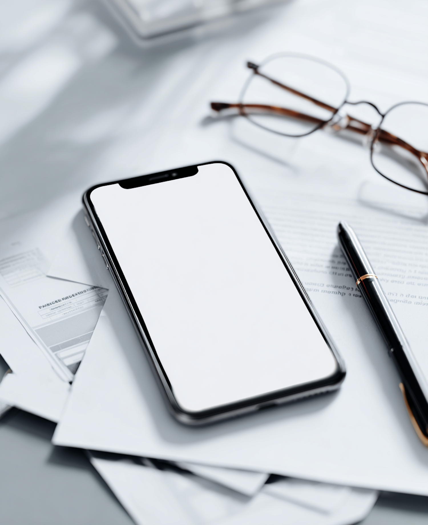 Minimalist office setup with glasses, a pen, and a smartphone on documents, ideal for promoting productivity and efficiency.