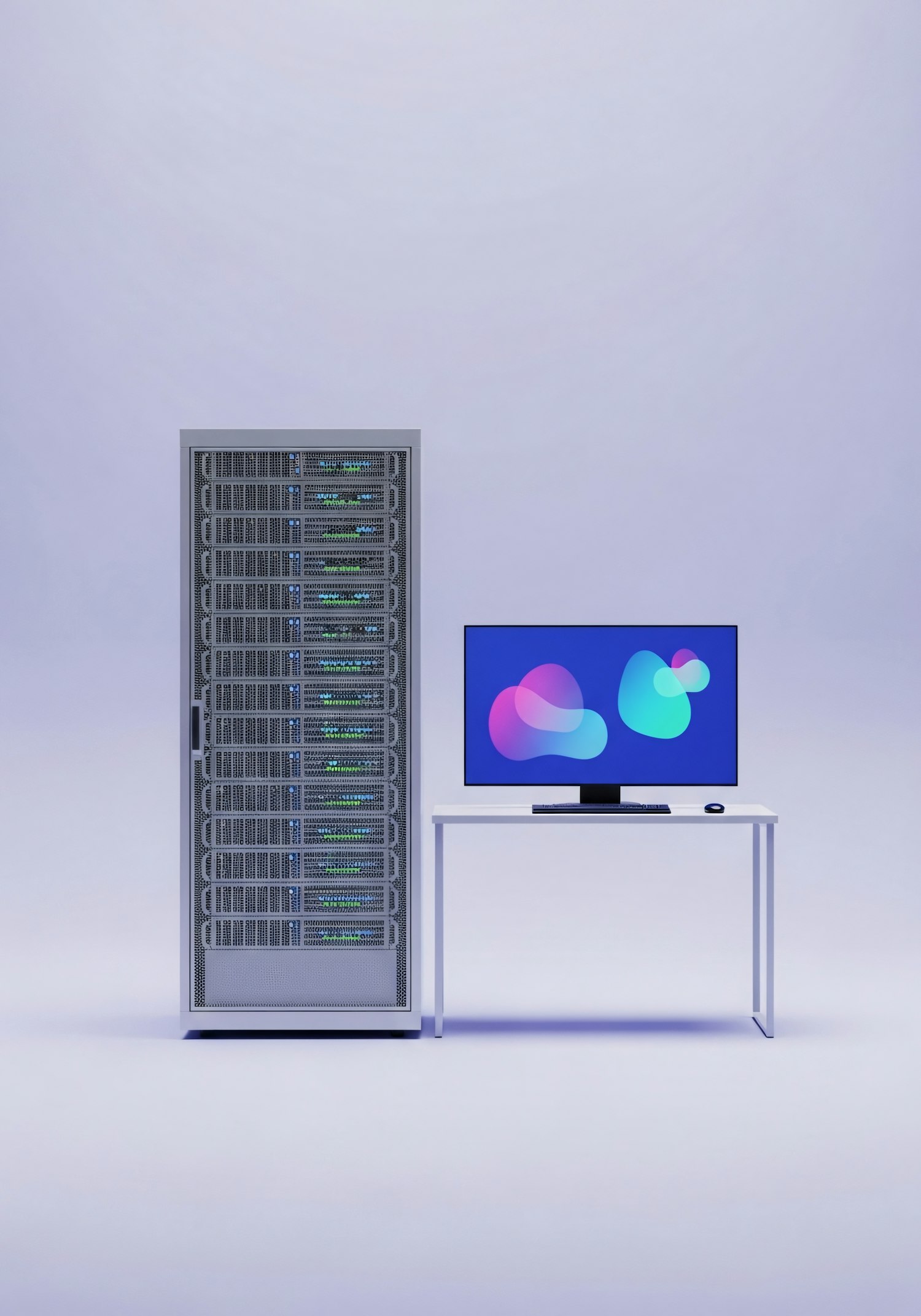 A server rack and a minimalist desk with a monitor displaying abstract art, set against a soft purple gradient background.
