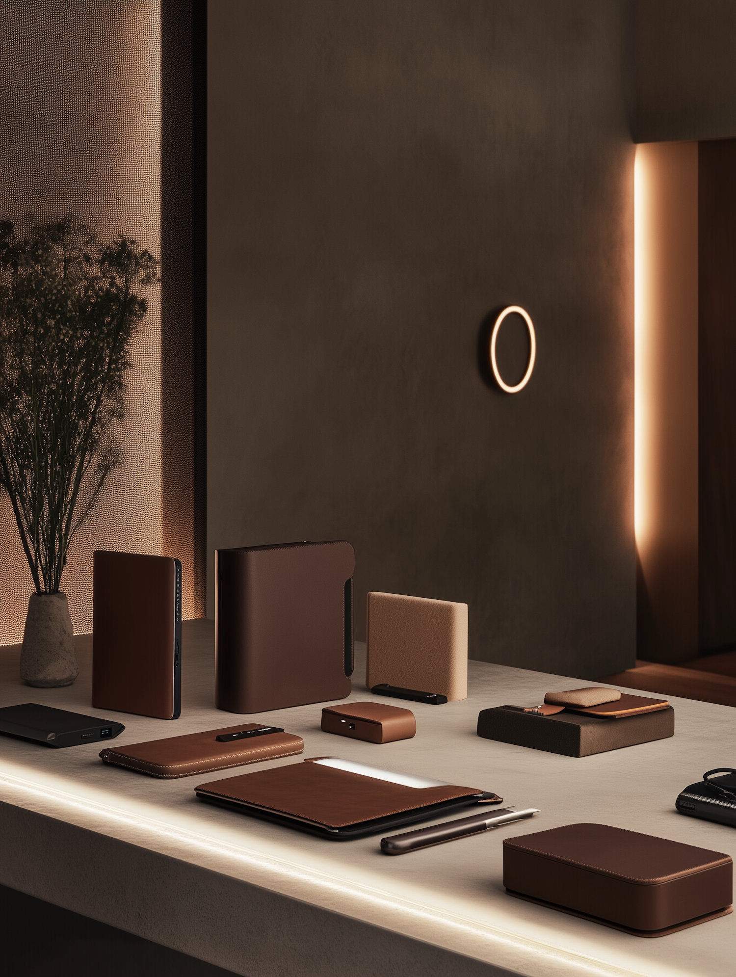 Minimalist workspace with leather tech accessories in warm tones, soft lighting, and a modern aesthetic. Perfect for stylish organization.