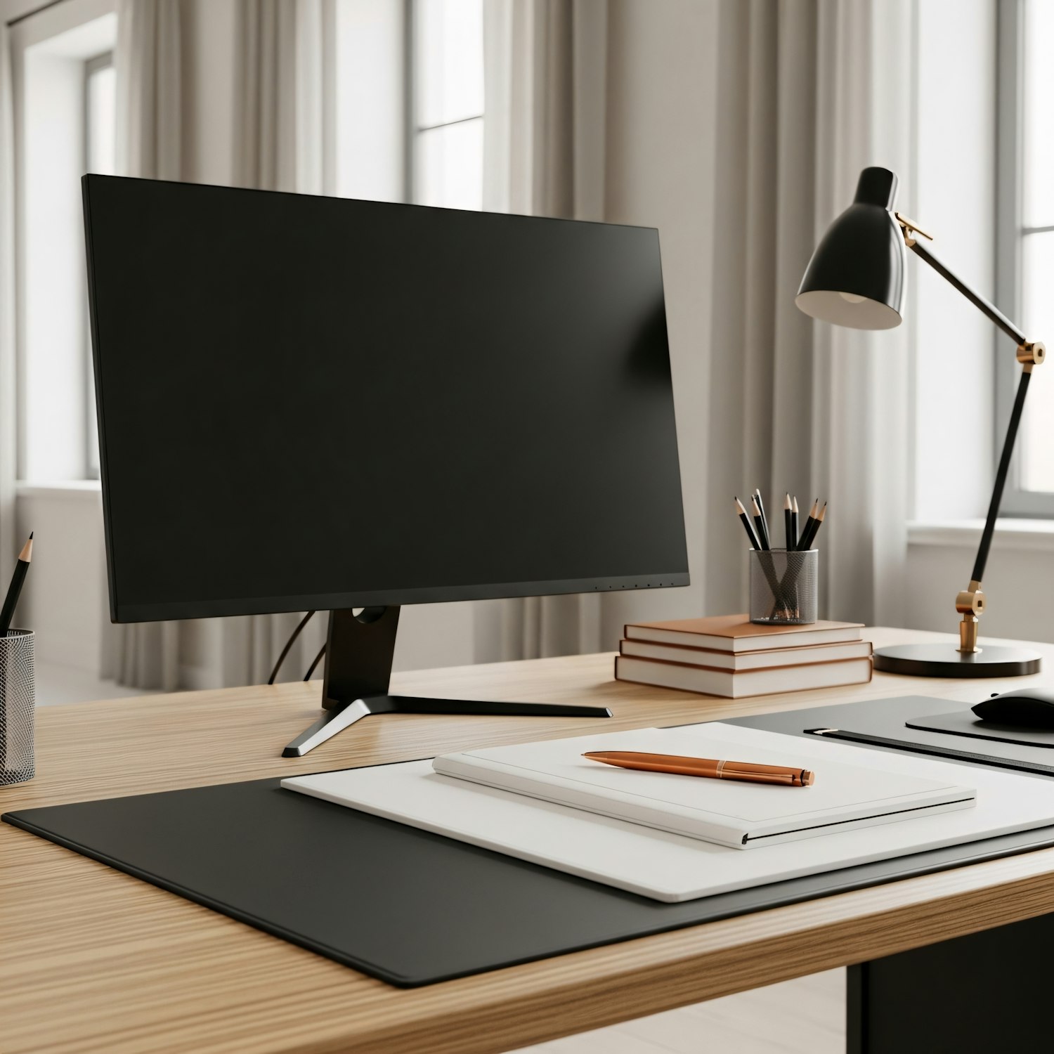 A clean and modern workspace with a sleek monitor, organized desk accessories, and natural light from large windows.