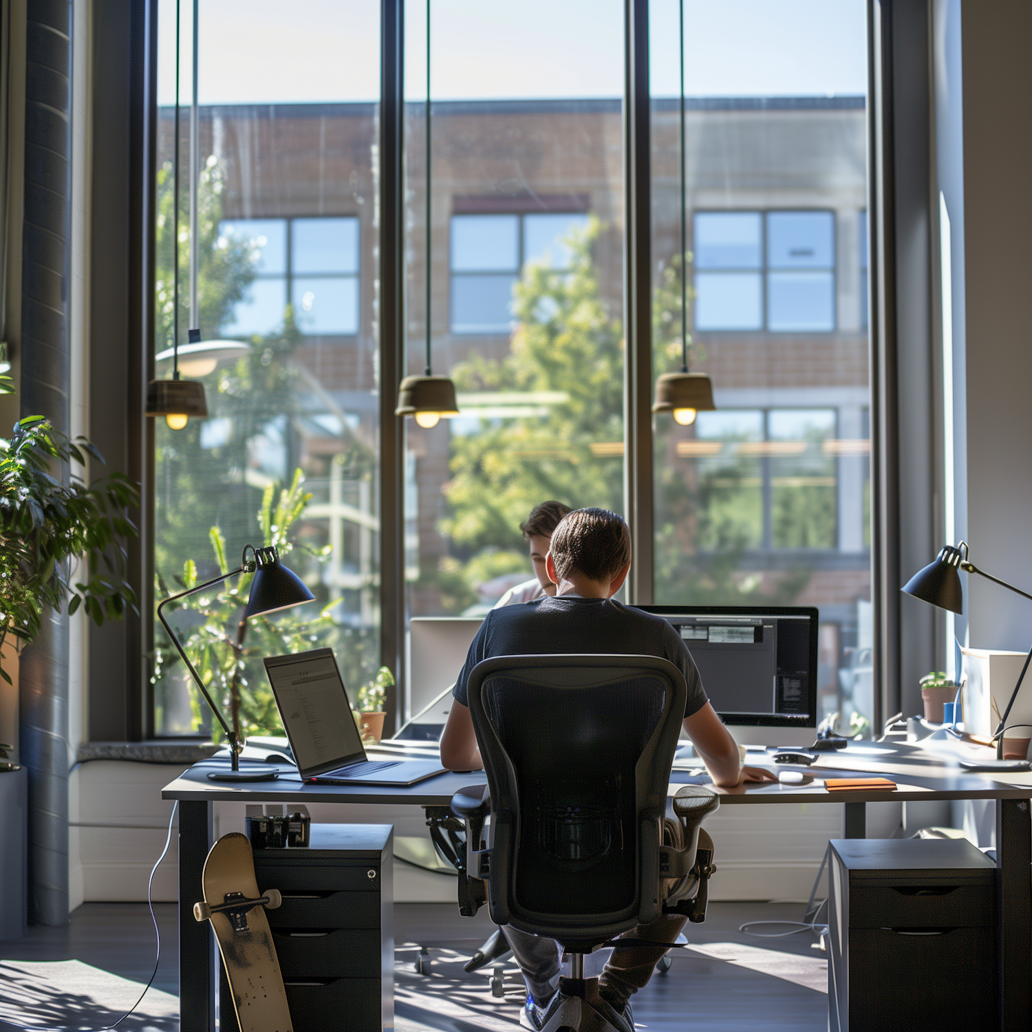 Modern office with large windows, two people working at desks, plants, and a skateboard leaning against a desk.