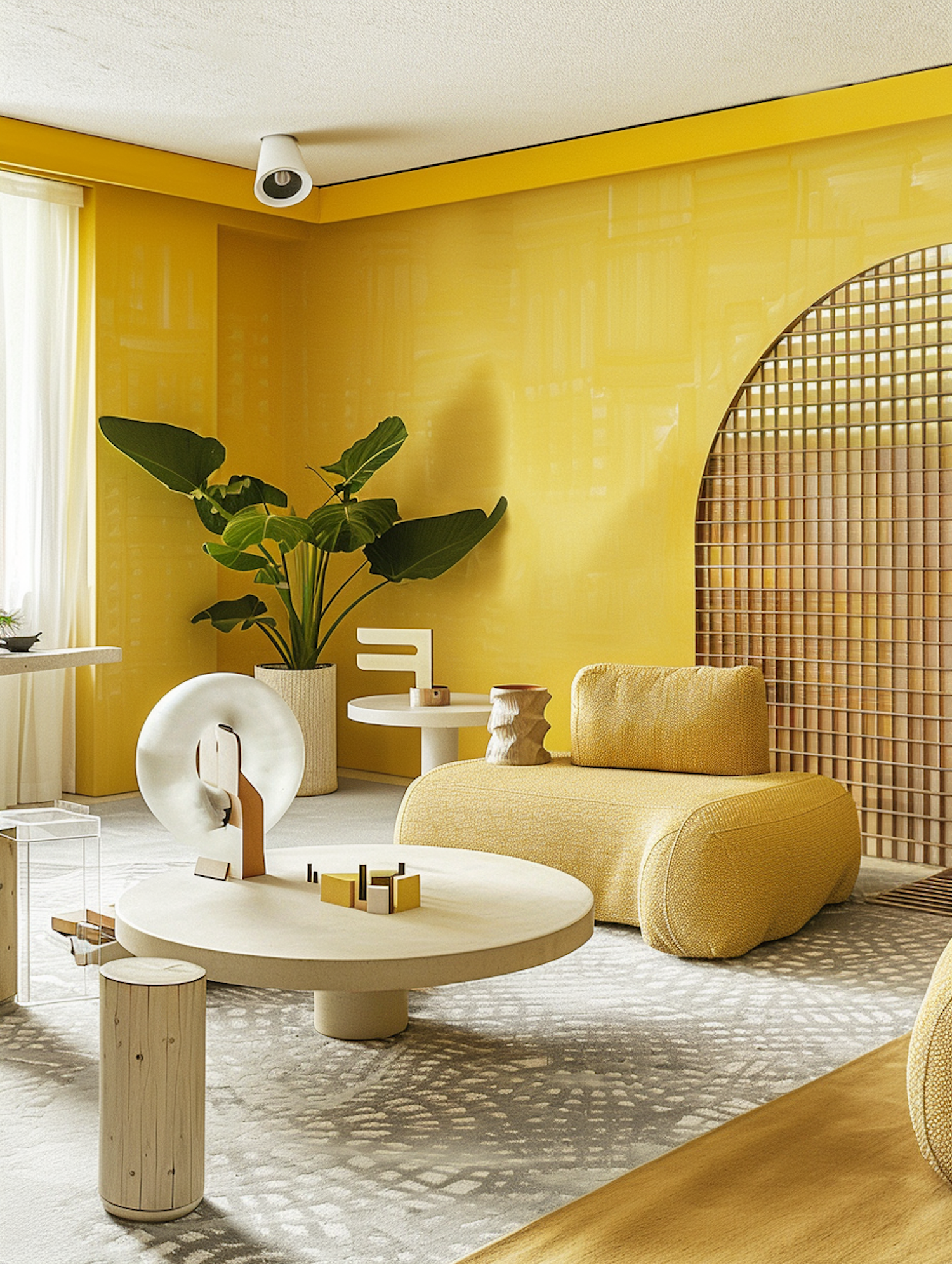 Modern yellow-themed living room with minimalist furniture, abstract decor, and a unique arched wall design.