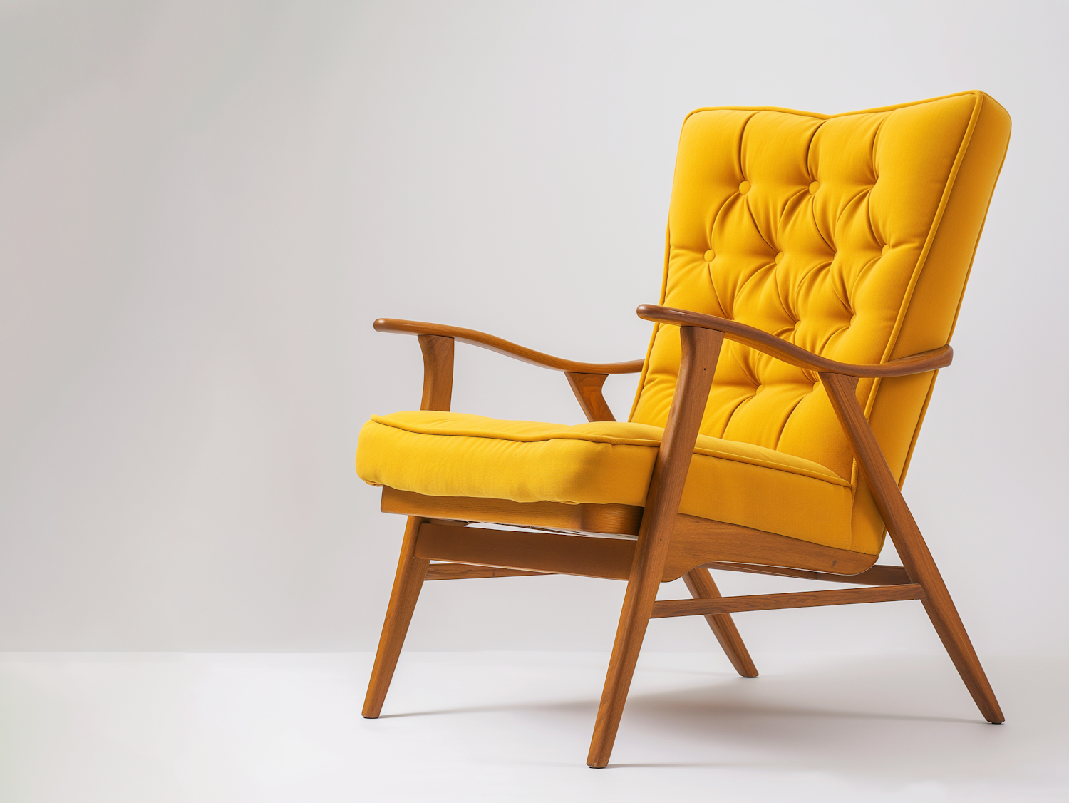 Mid-century modern armchair with yellow tufted upholstery and wooden frame, perfect for stylish interiors.