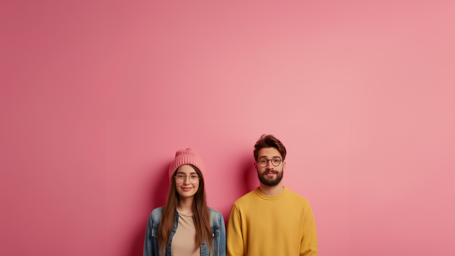 Young woman in pink beanie and man in yellow sweater against a pink background, both wearing glasses and looking at the camera.