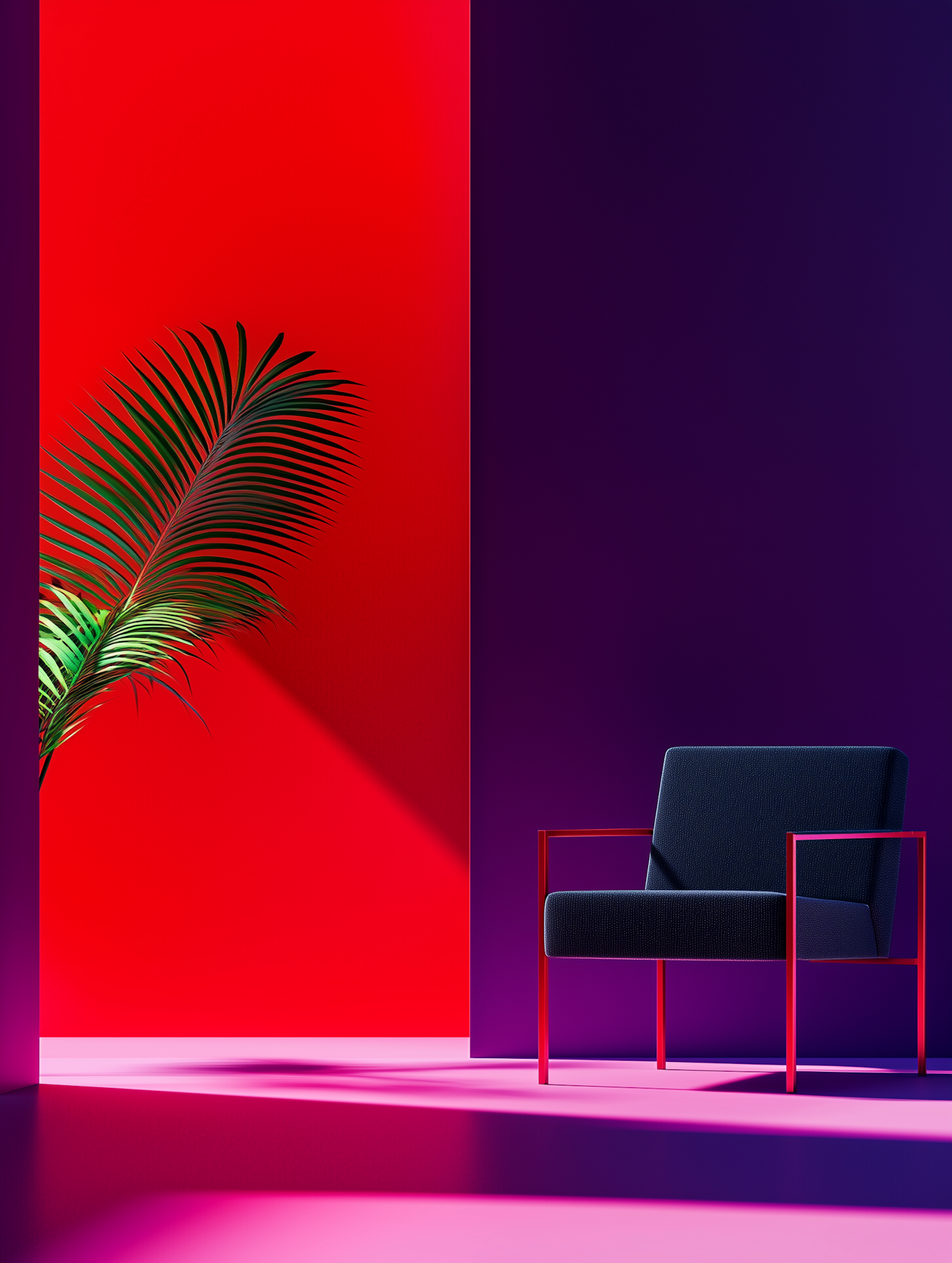 Modern interior with a dark blue chair, red wall, and green palm leaf on a vibrant pink floor. Bold colors and geometric design.