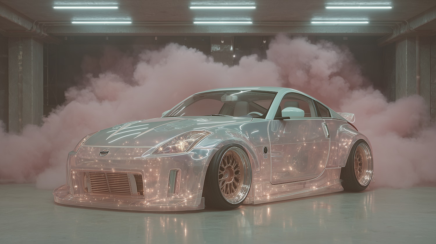 A polished sports car with custom rims in a smoky industrial setting, illuminated by fluorescent lights and surrounded by pink smoke.