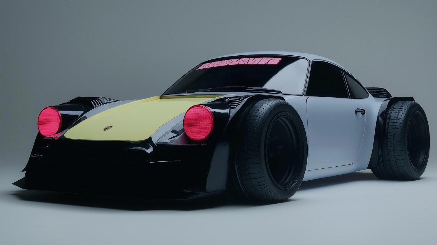 Futuristic sports car with a black body, yellow hood, pink headlights, and oversized wheels. Bold design with a tinted windshield.