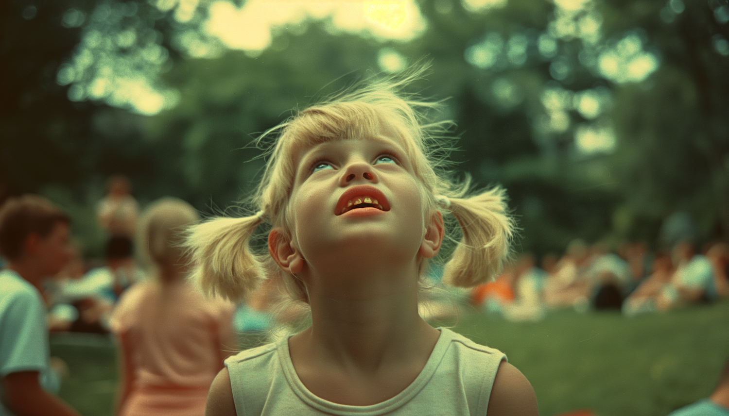 Young girl with blonde pigtails gazes upwards in a park, surrounded by blurred figures, evoking a sense of wonder and nostalgia.