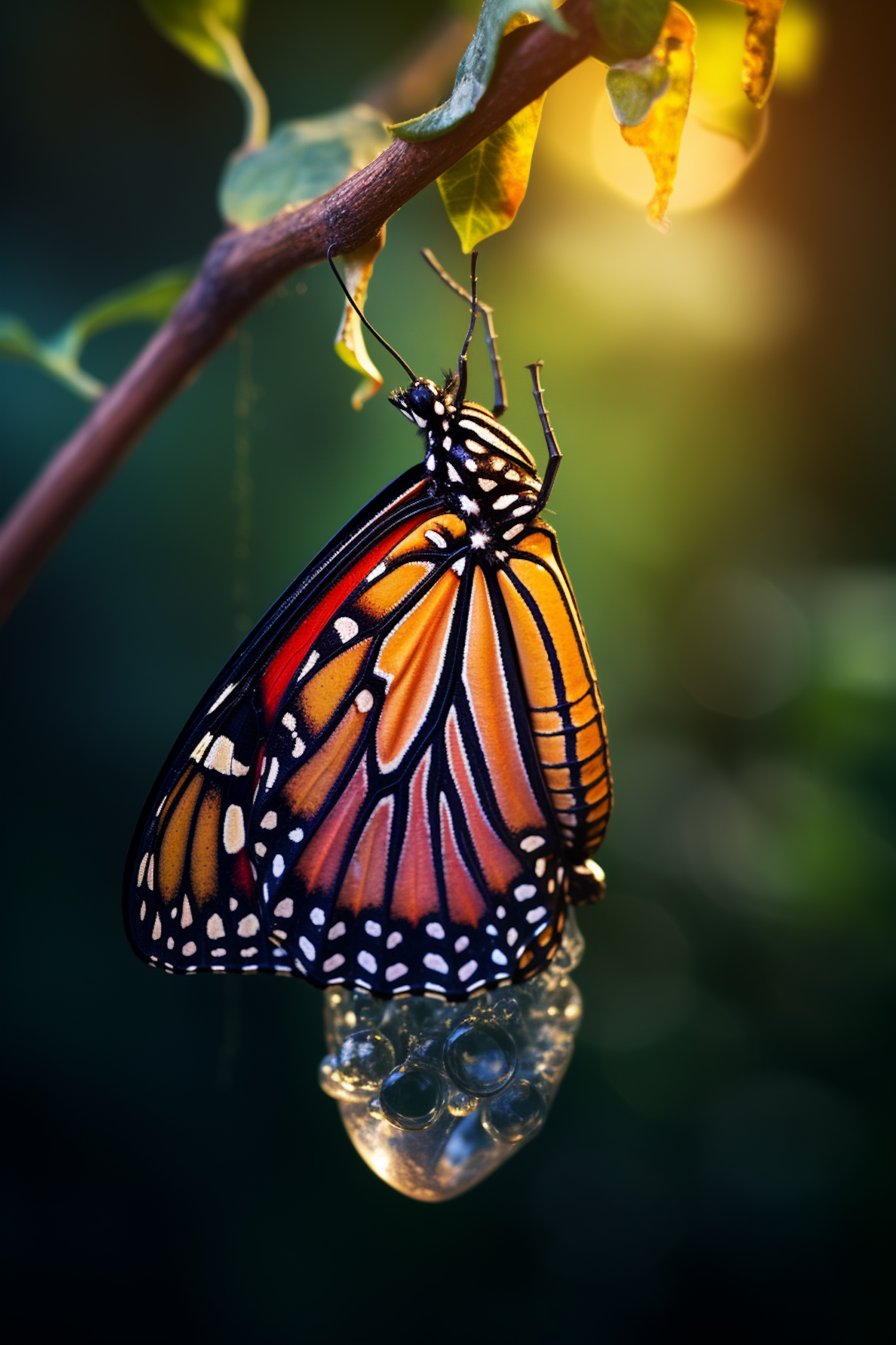 Monarch butterfly emerging from chrysalis on a branch, vibrant colors, warm light, nature's transformation captured beautifully.