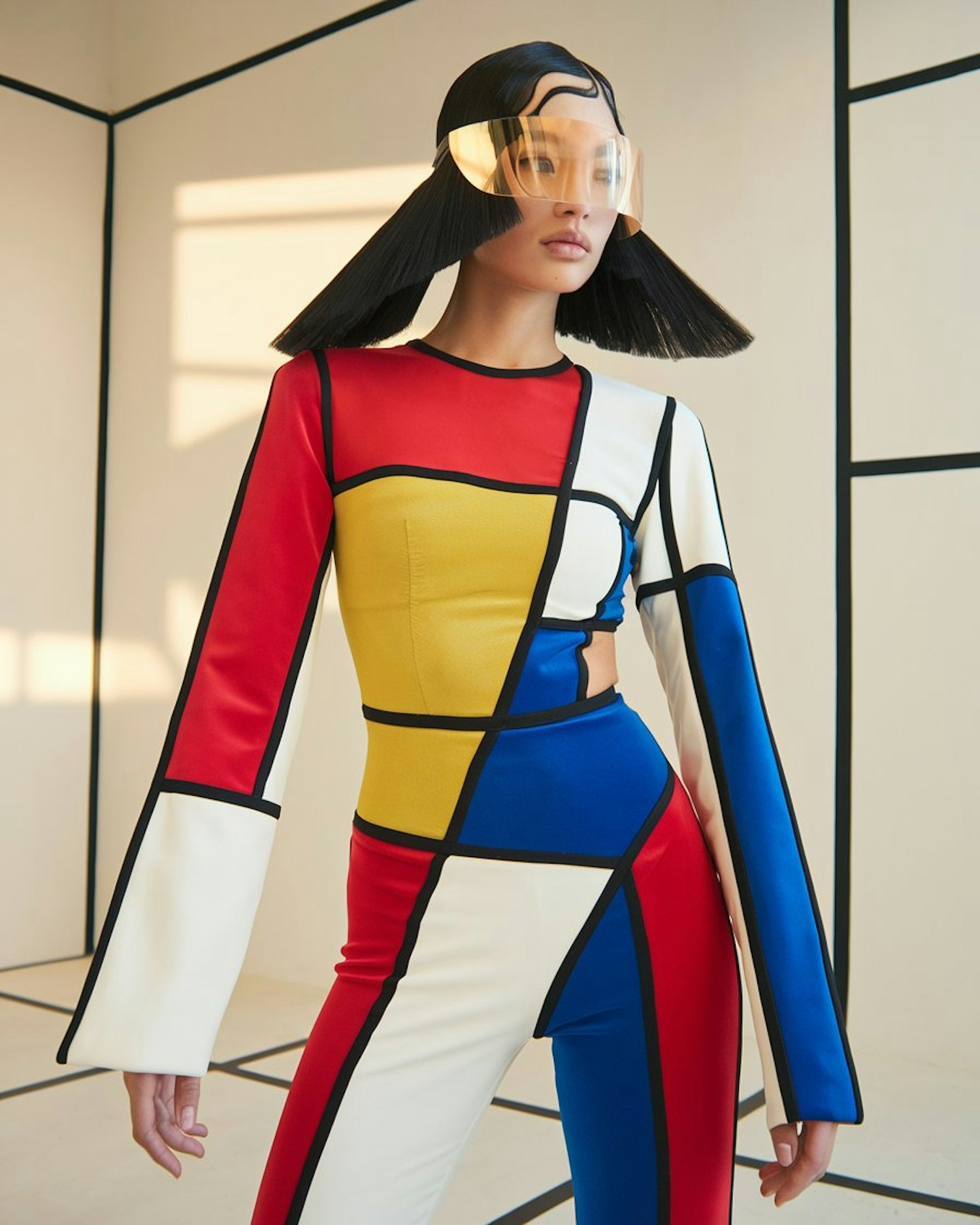 Bold Mondrian-inspired outfit with red, yellow, and blue color blocks, paired with futuristic amber visor glasses and sleek black hair.