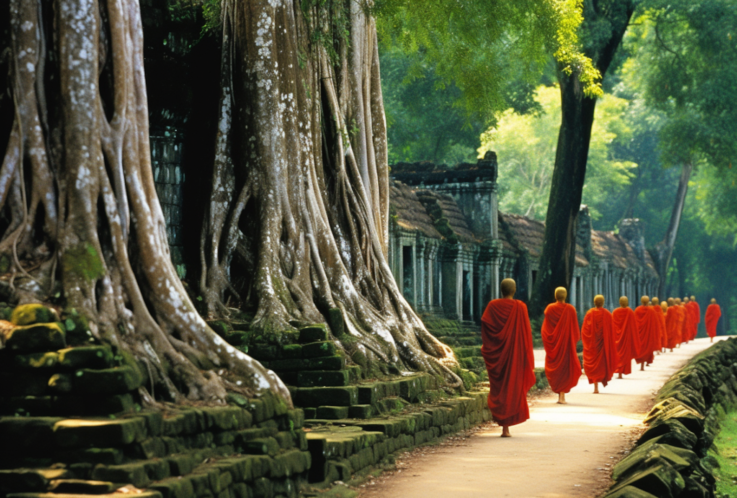 Buddhist monks in orange robes walk along a path lined with ancient trees and stone structures, creating a serene and mystical scene.