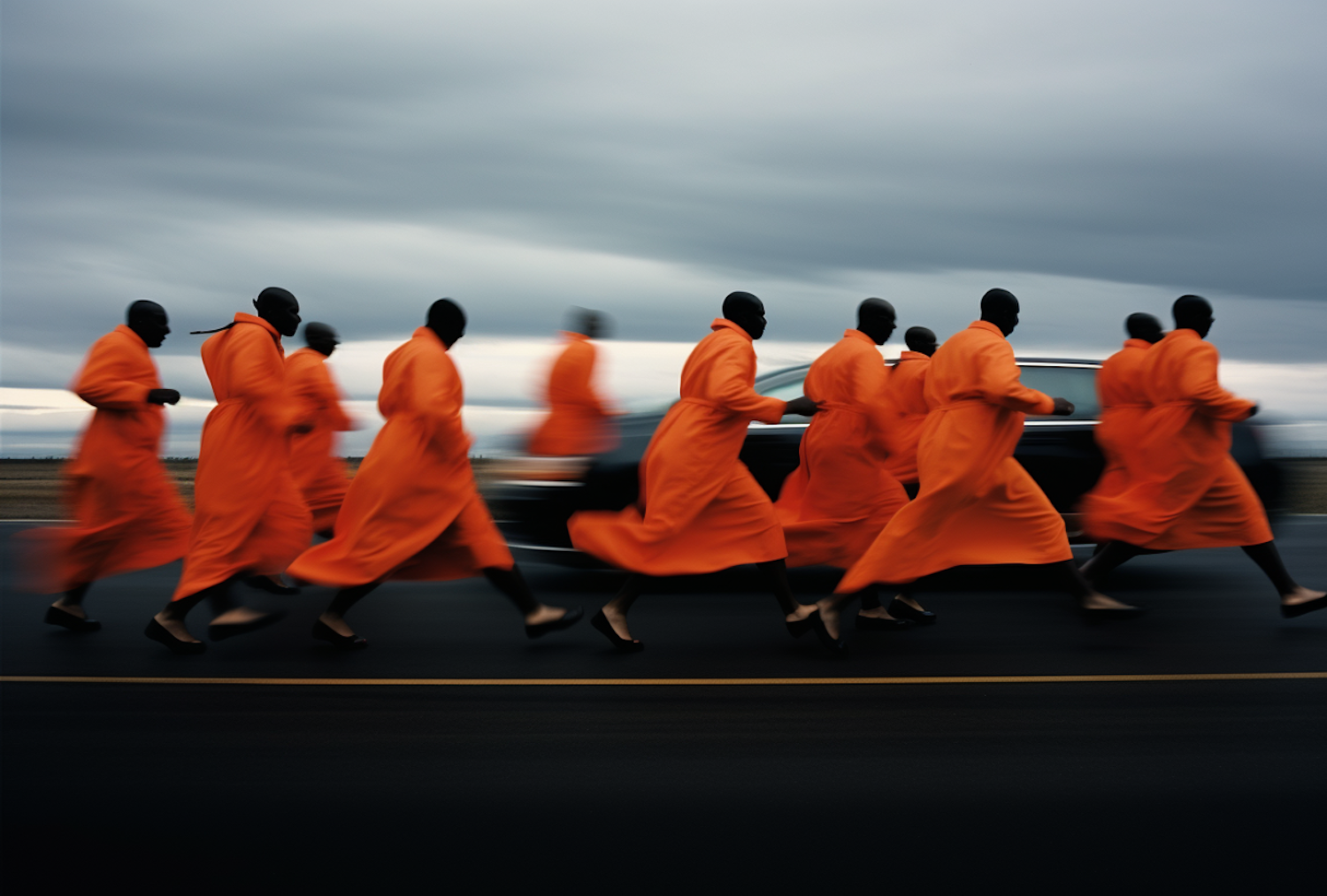 Dynamic scene of individuals in orange robes running along a road, with blurred motion and an overcast sky enhancing the vibrant colors.