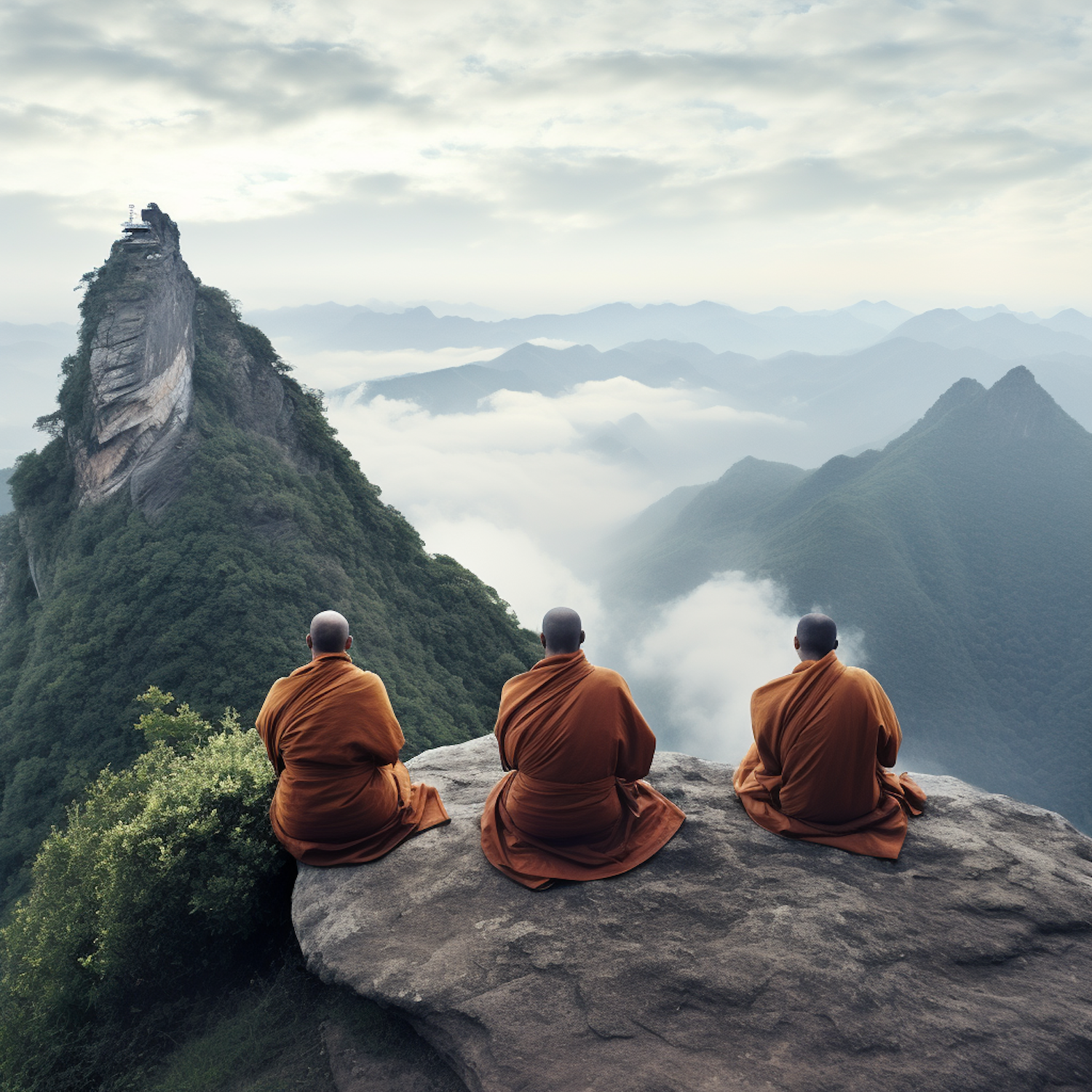 Three Buddhist monks in orange robes meditate on a rock, overlooking misty green mountains and a distant peak with a small structure.