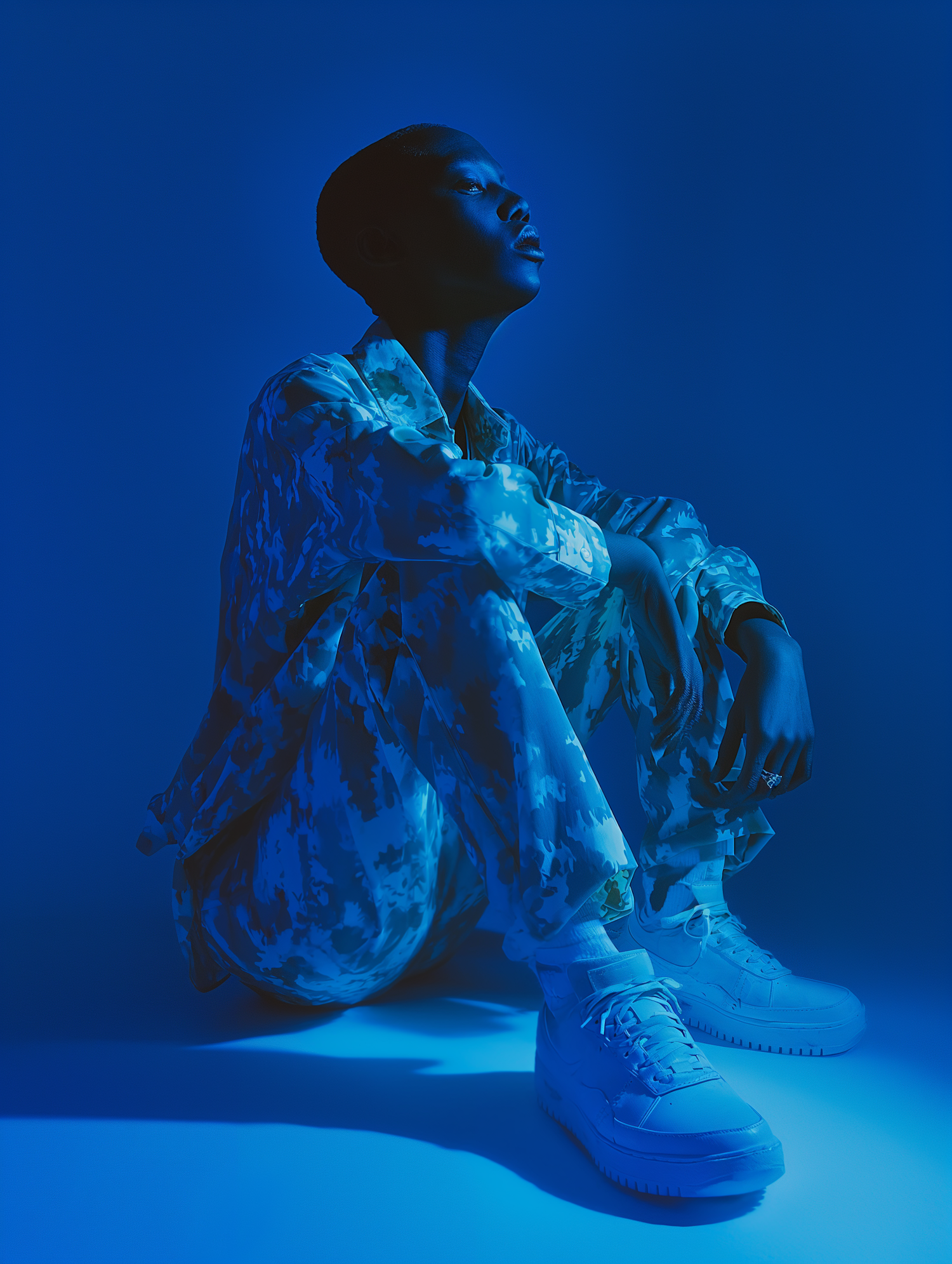 A person in blue camouflage attire sits contemplatively under dramatic blue lighting, creating a striking visual effect.