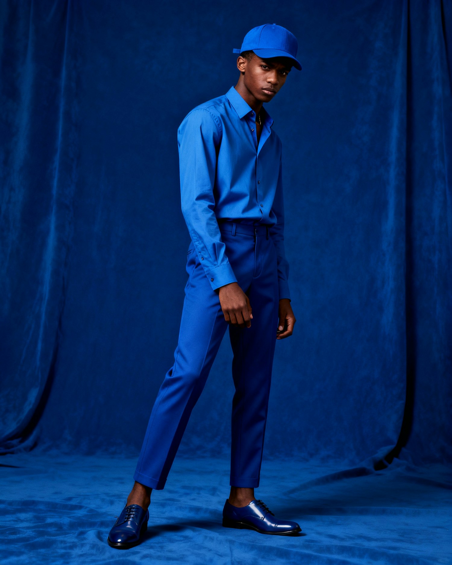 High-definition, cinematic full-body portrait of a stylish young Black man wearing a fitted blue cap and matching tailored shirt, paired with sleek trousers and polished shoes. He stands confidently against a vibrant blue background that creates a striking monochromatic effect. His pose is dynamic, slightly angled, conveying intensity and editorial flair, while his serious, contemplative expression adds depth. Soft, directional lighting highlights the textures of his shirt, the cap, and the contours of his skin, with subtle rim lighting adding dimension and drama. The overall mood is bold, modern, and fashion-forward—youthful energy meets high-fashion editorial storytelling.