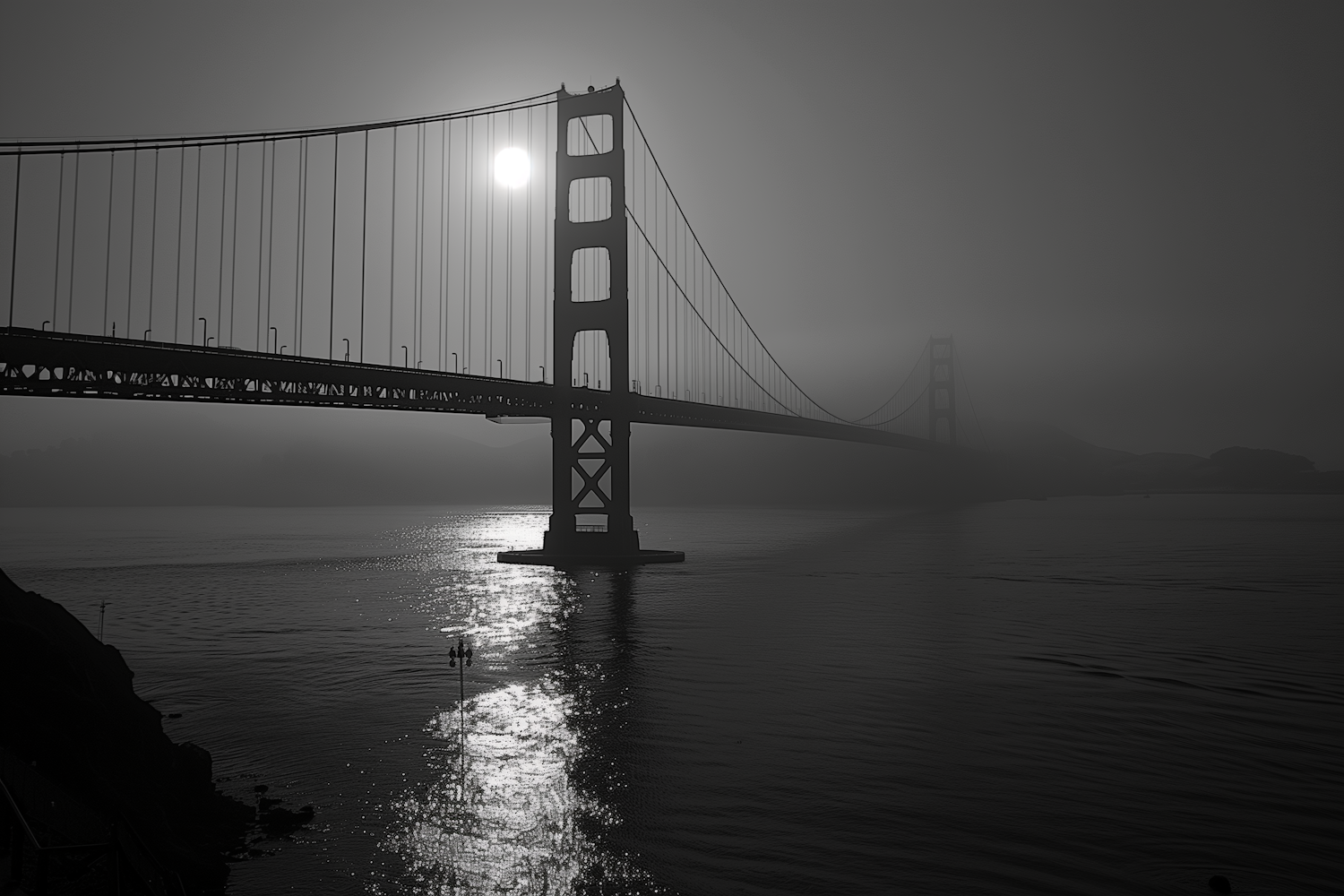 Monochrome view of the Golden Gate Bridge in mist, with sun reflecting on water, creating a serene and mysterious atmosphere.