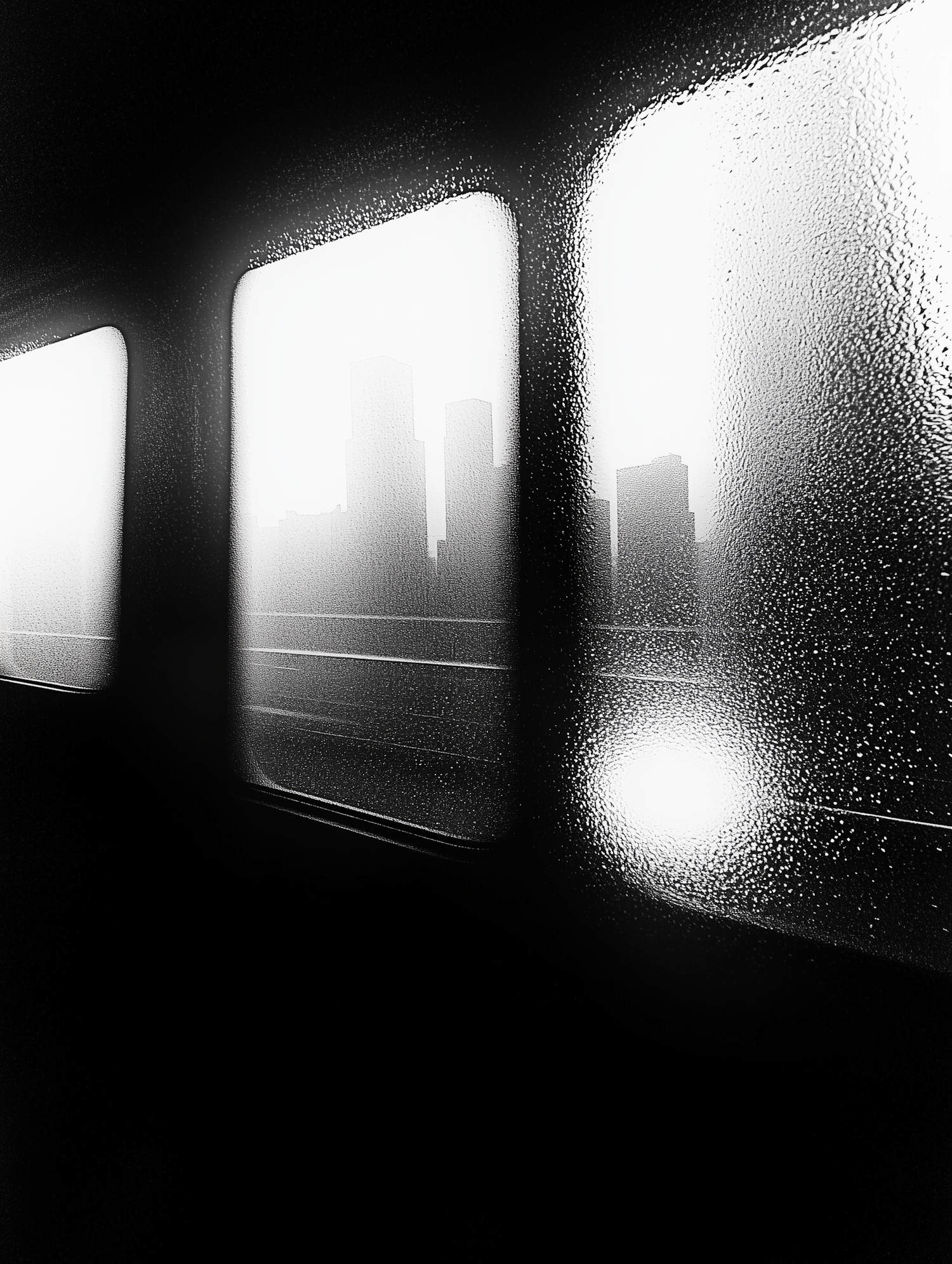 Monochrome view through a rain-speckled window, revealing a city skyline silhouette against a bright sky.