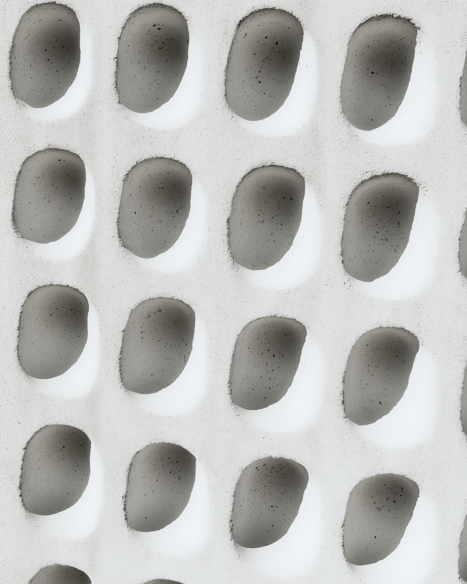 Close-up of a textured surface with uniform, concave indentations creating a rhythmic pattern. Light gray material with subtle shadows.
