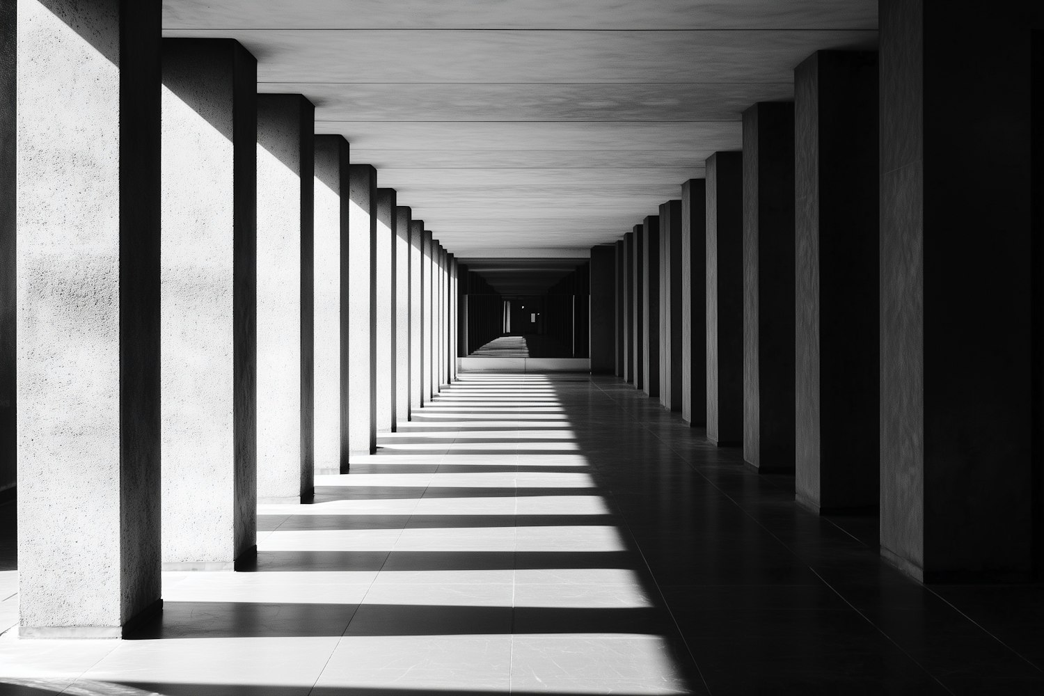 A minimalist black-and-white corridor with geometric columns casting sharp shadows, leading to a bright vanishing point.