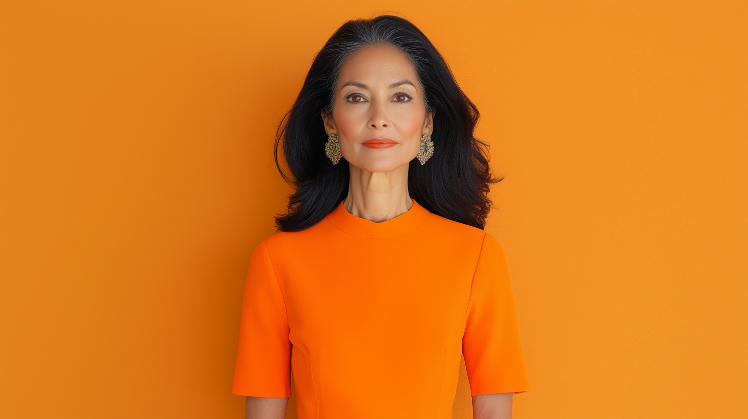 Elegant Asian woman in an orange dress against a vibrant orange background, exuding confidence and style with ornate earrings.