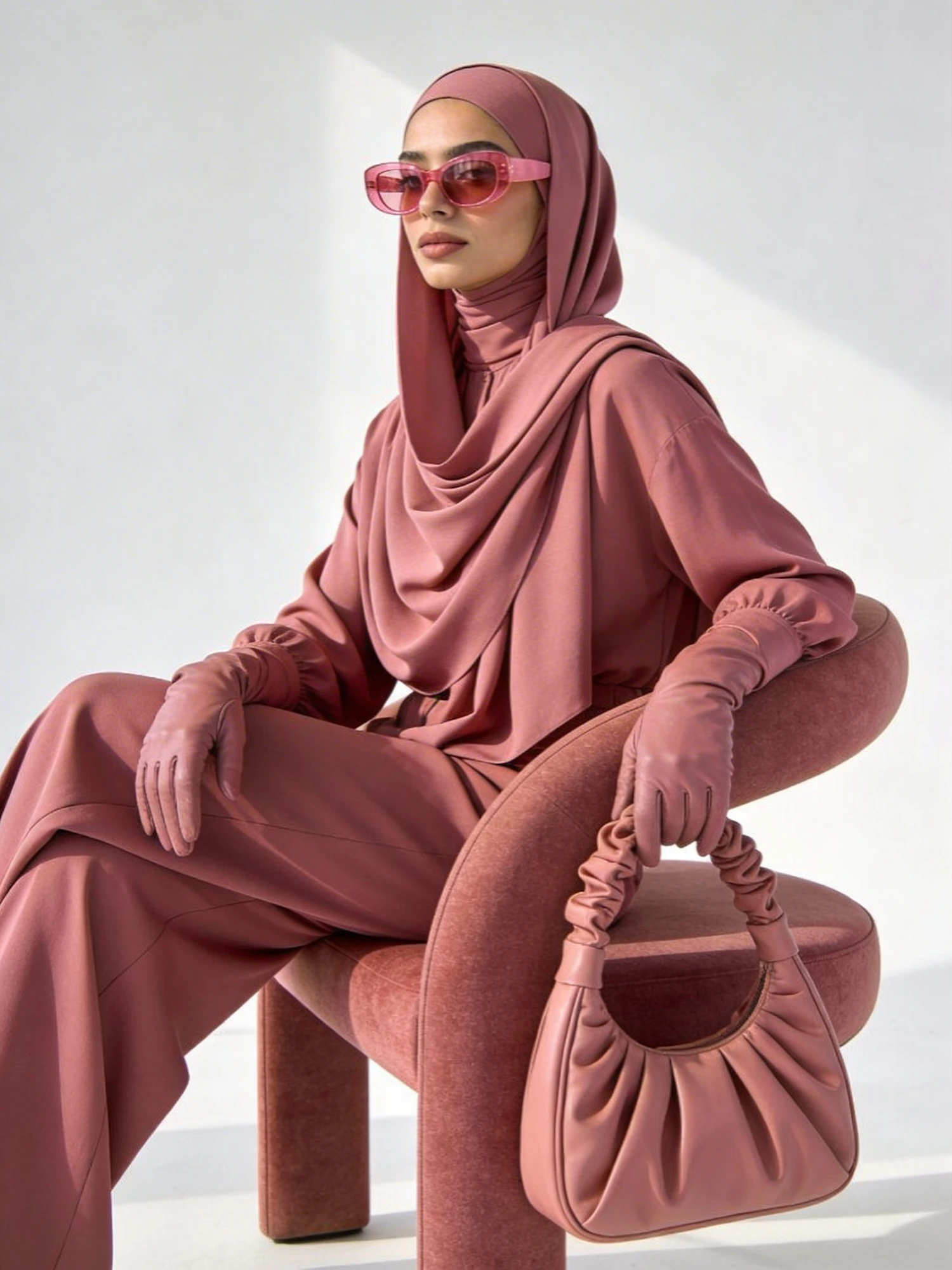 A high‑definition, minimalist editorial portrait. A stylish person sits on the armrest of a curved modern accent chair in muted dusty‑rose upholstery. They wear a monochrome dusty‑rose ensemble: long‑sleeved top with relaxed drape, wide‑leg trousers, and a sculptural hijab styled with elegant folds. Accessories include rose‑tinted sunglasses, fitted gloves, and a soft‑structured slouch bag in the same tone. Soft natural daylight and warm shadows create a gentle, editorial glow against a clean white background. No logos, no watermarks, no extra text.