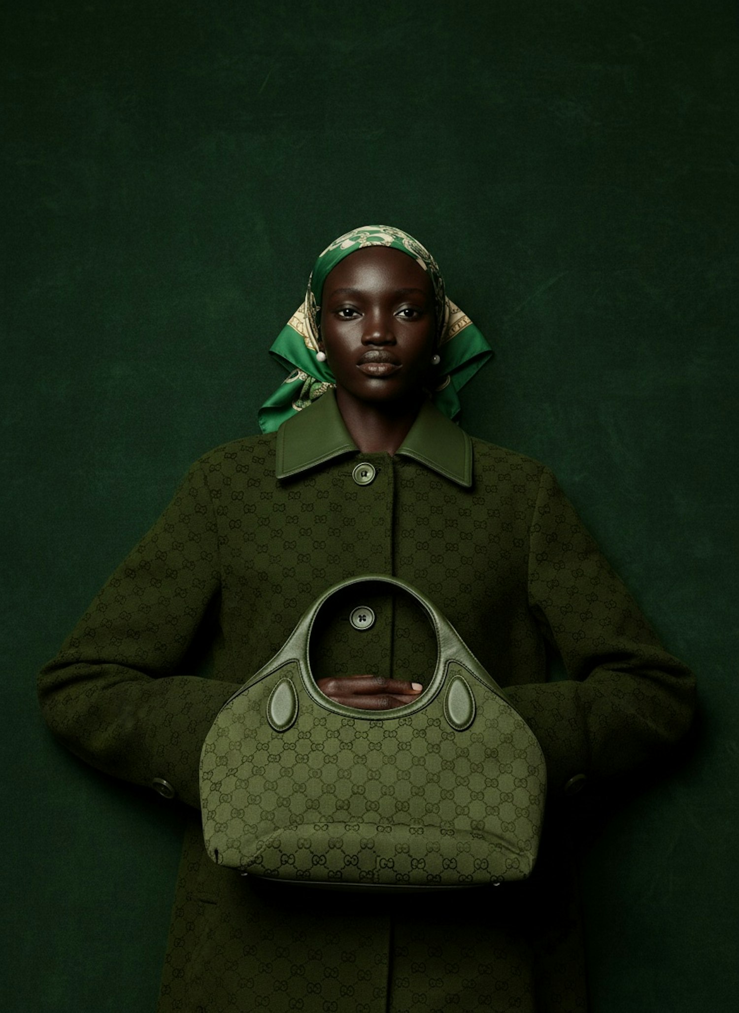 A stylish individual in a green outfit and headscarf holds a matching patterned handbag against a green background.