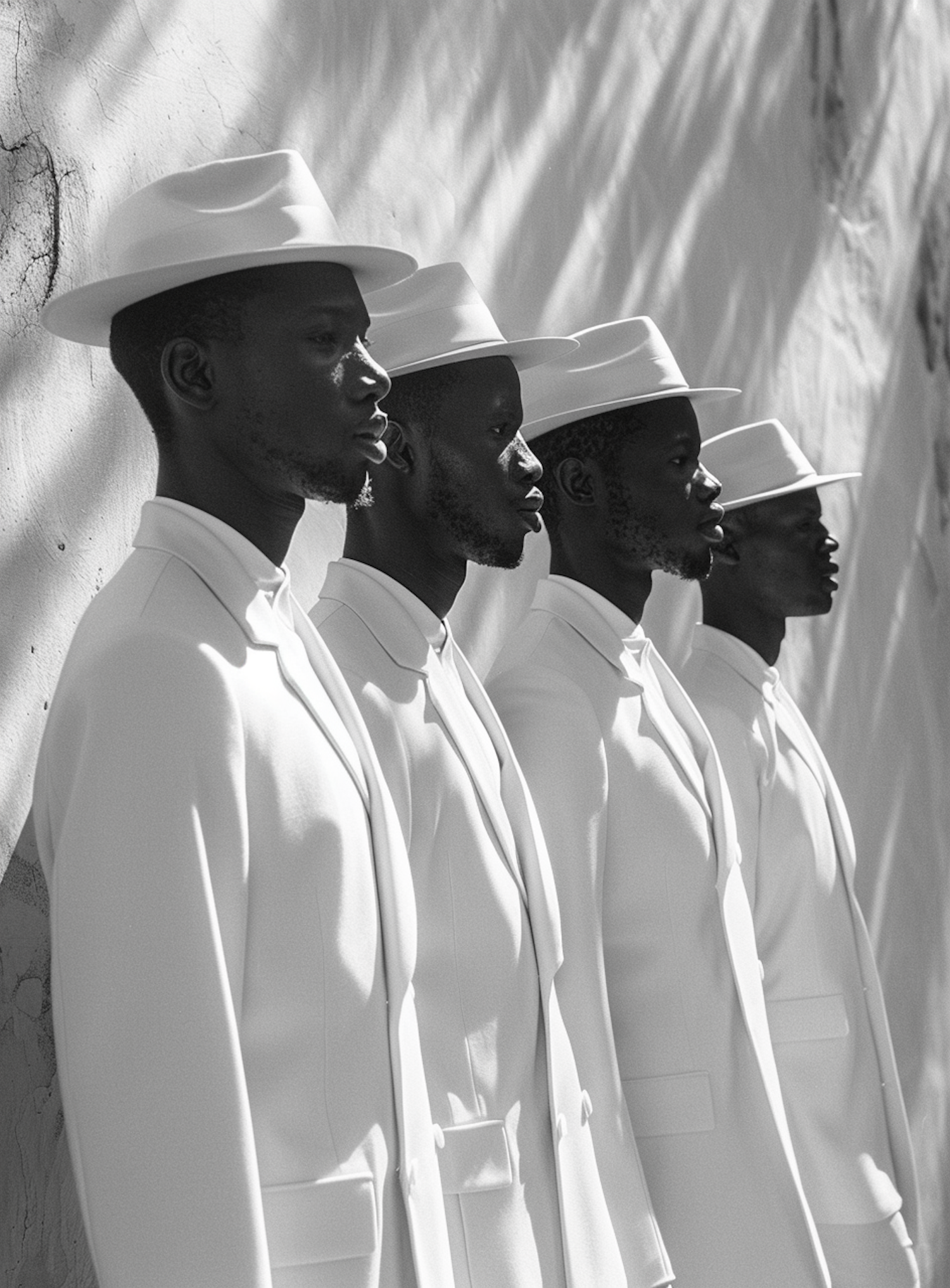 Four men in white suits and hats stand in line against a textured wall, creating a striking monochrome composition.