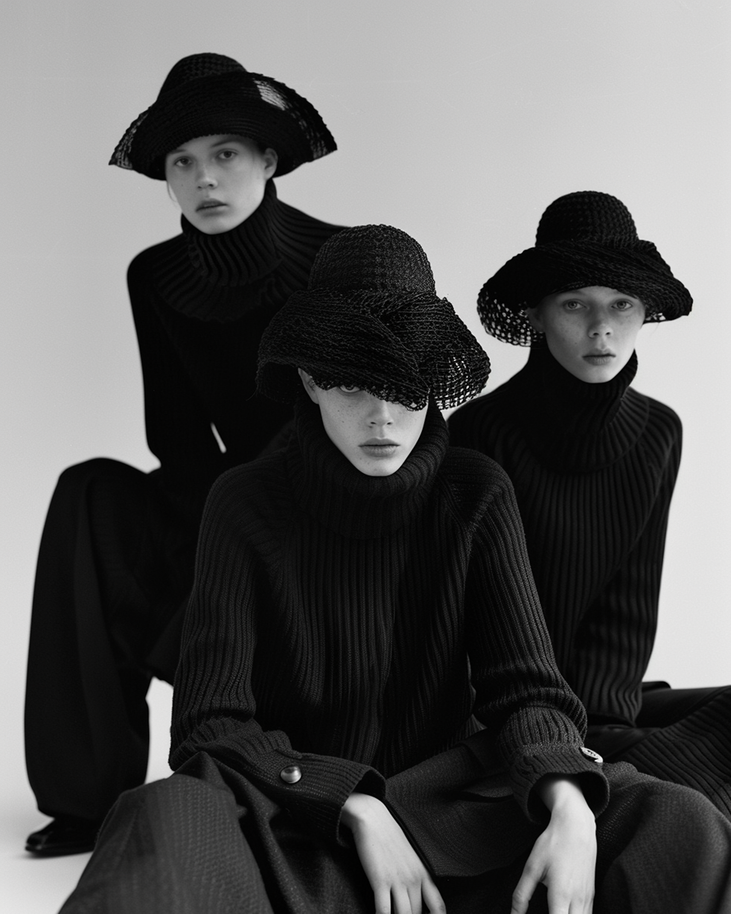 Three individuals in black turtlenecks and wide-brimmed hats in a monochrome setting, showcasing dramatic fashion and textures.