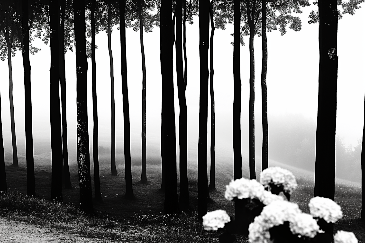 Misty forest with tall trees and white flowers in the foreground, creating a serene and ethereal atmosphere.