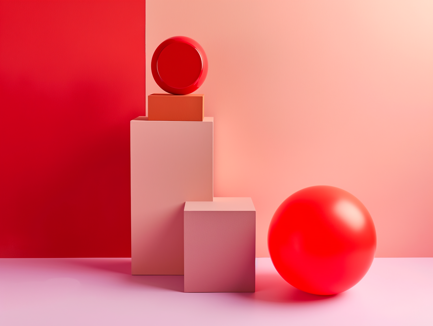 Minimalist geometric composition with red sphere, pastel blocks, and bold red-peach background. Modern and vibrant design.