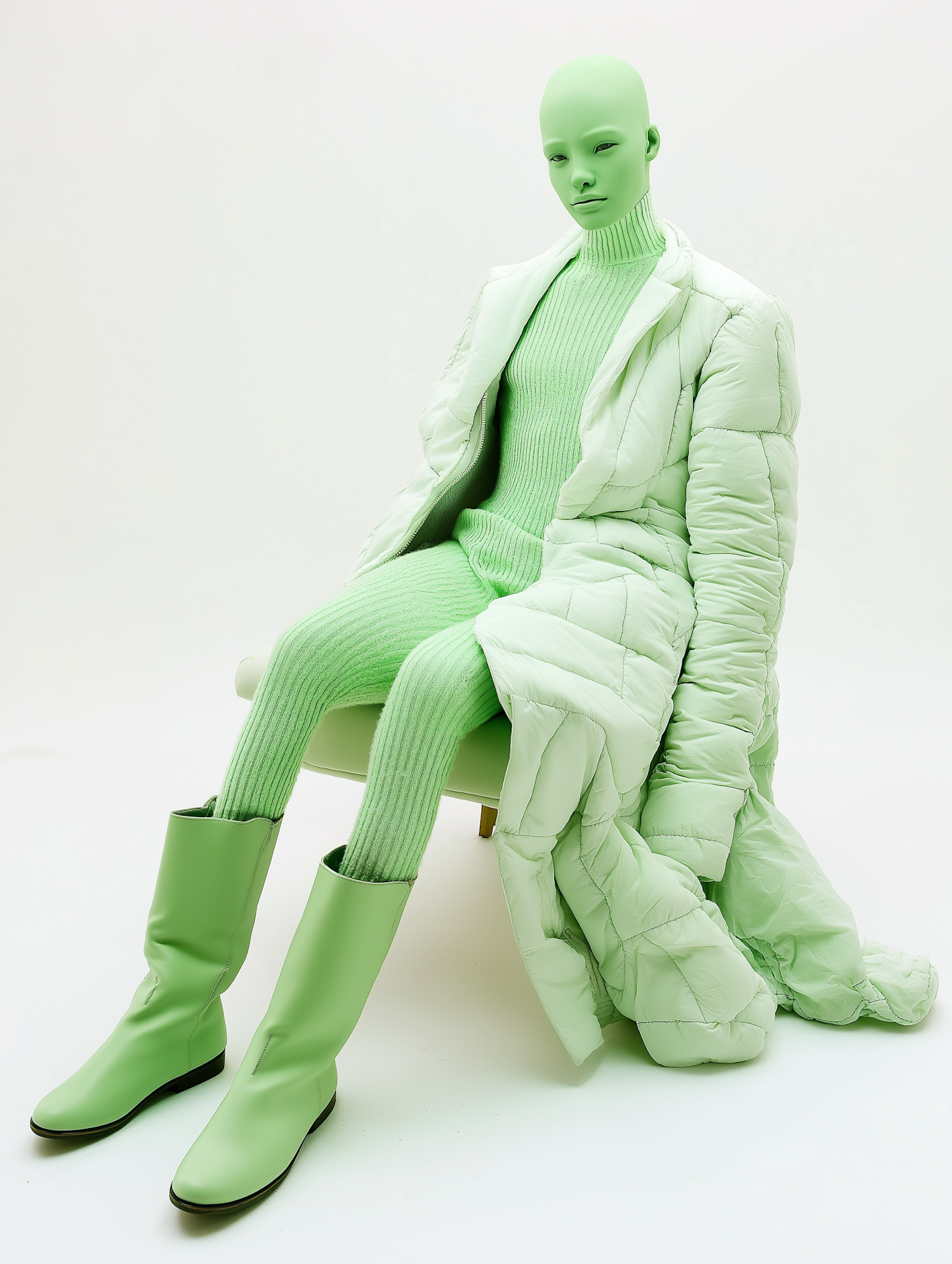 Monochromatic green mannequin in a ribbed sweater, quilted coat, and boots, set against a light green background.
