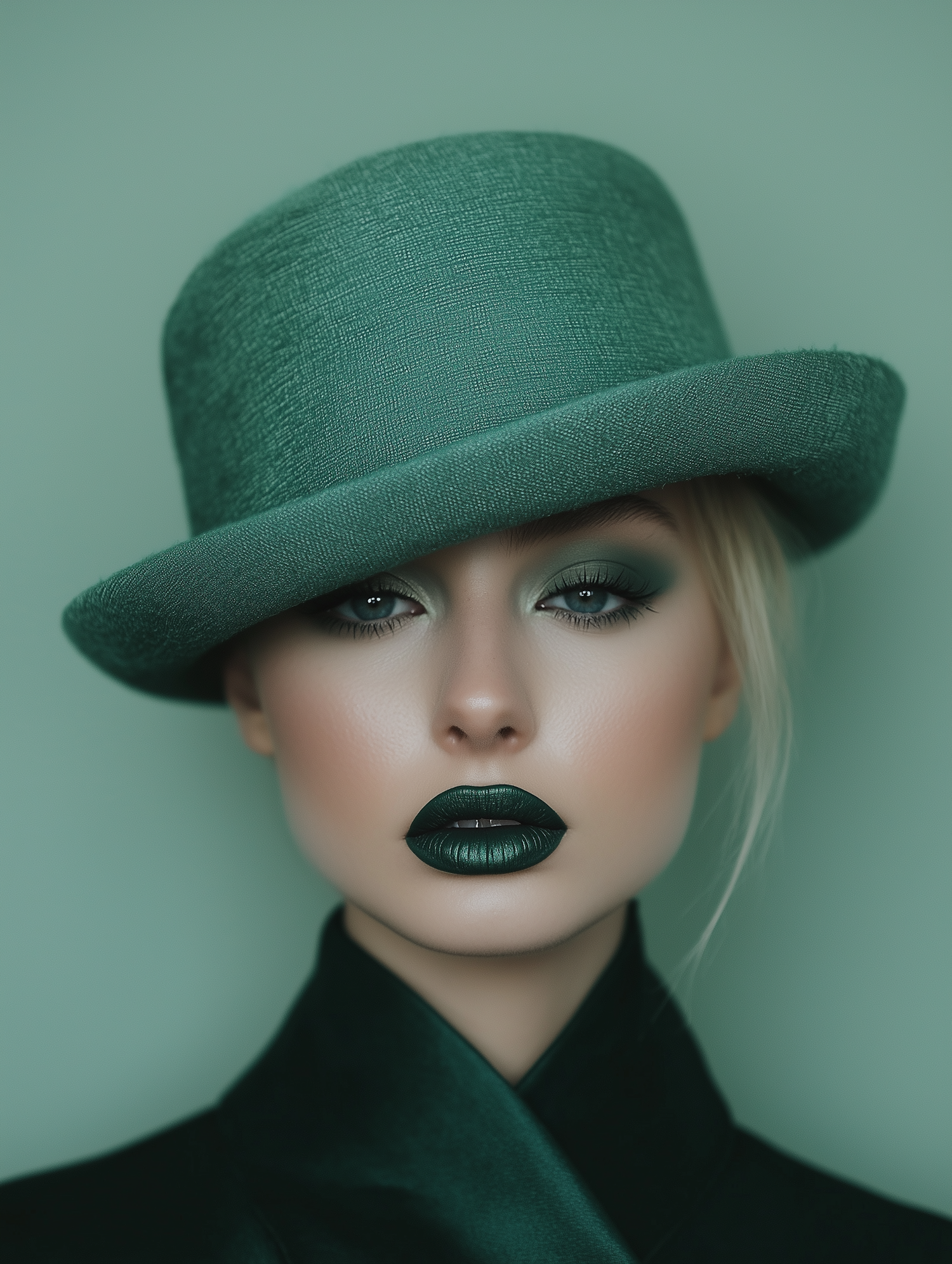 Elegant portrait of a woman in green hat and makeup, featuring bold green lipstick and eyeshadow, set against a soft green background.