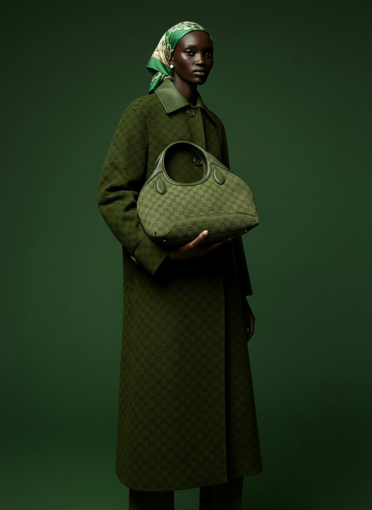 Stylish individual in a green coat and headscarf holding a matching handbag against a green background.