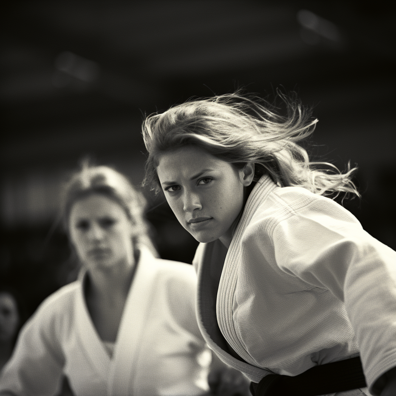 Intense black and white judo match with two women, highlighting focus and determination. Dramatic lighting and movement captured.