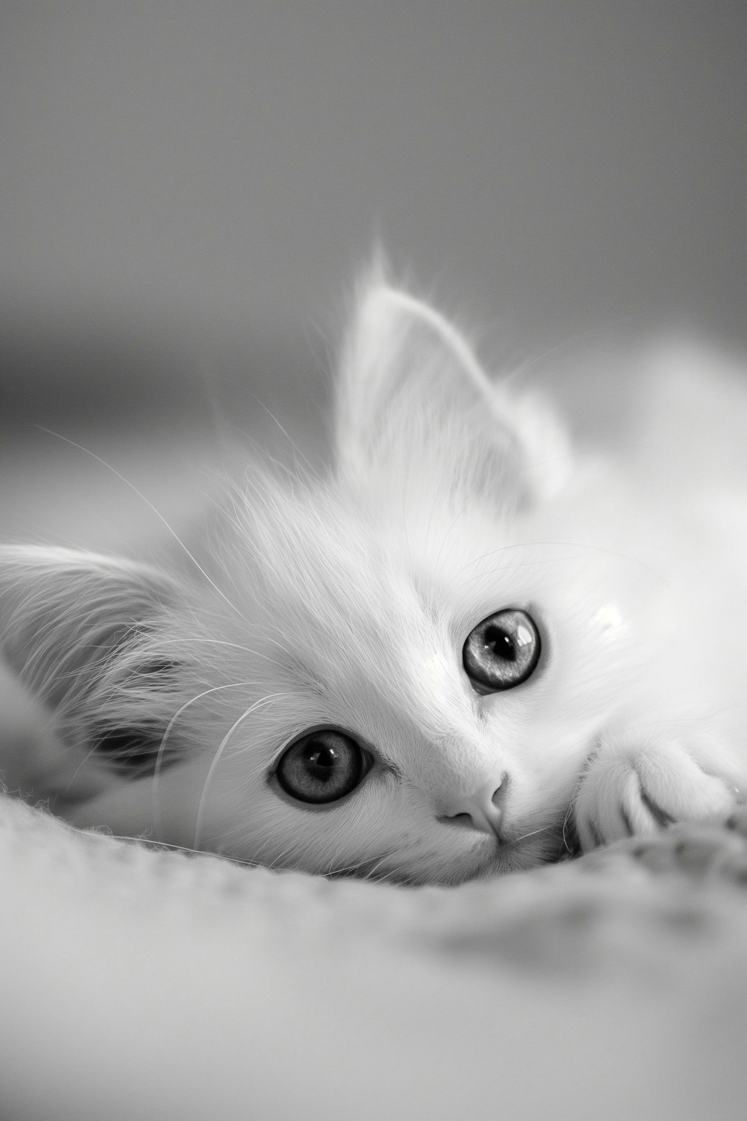 Adorable fluffy white kitten with big eyes in a serene monochrome setting, exuding warmth and tenderness.