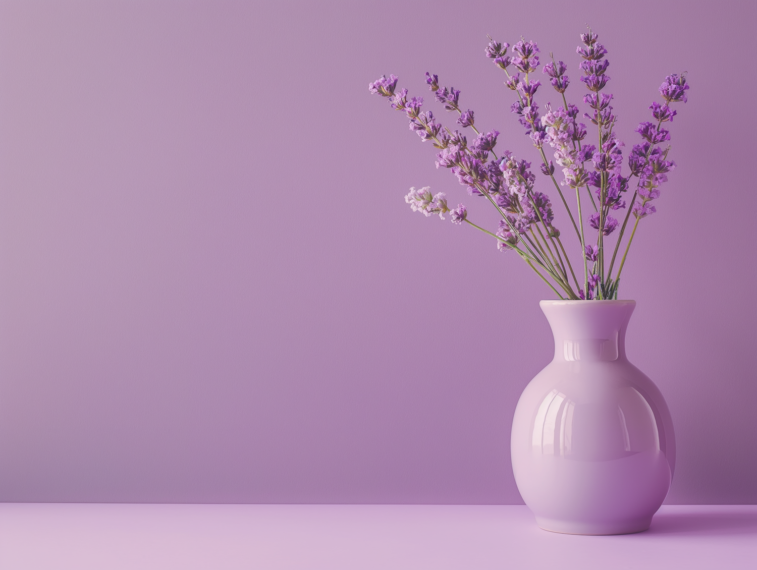 Lavender vase with sprigs of lavender flowers on a matching background, creating a calming and elegant scene.