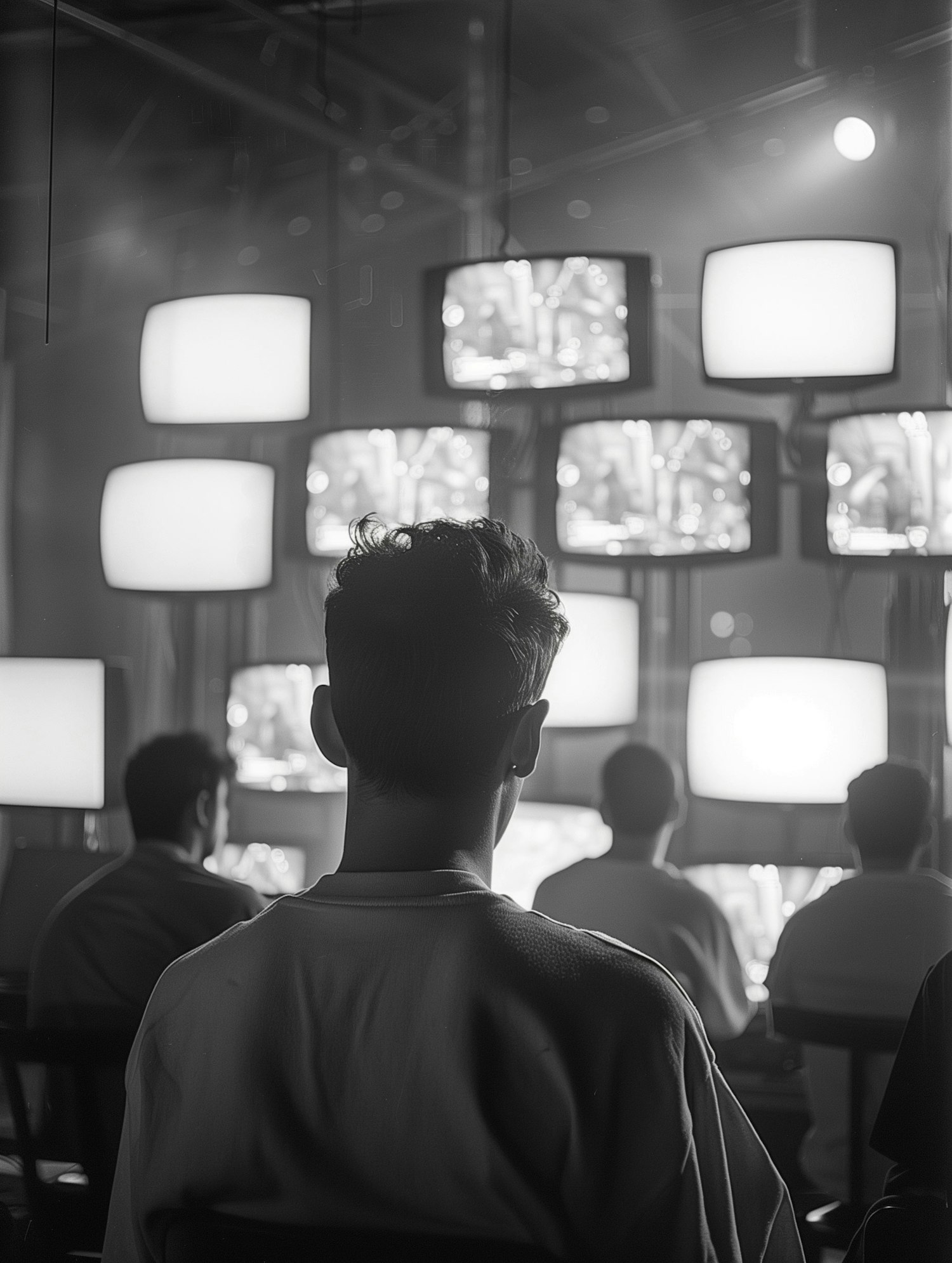 A group of people watch multiple TV screens in a dimly lit room, creating a focused and immersive atmosphere.