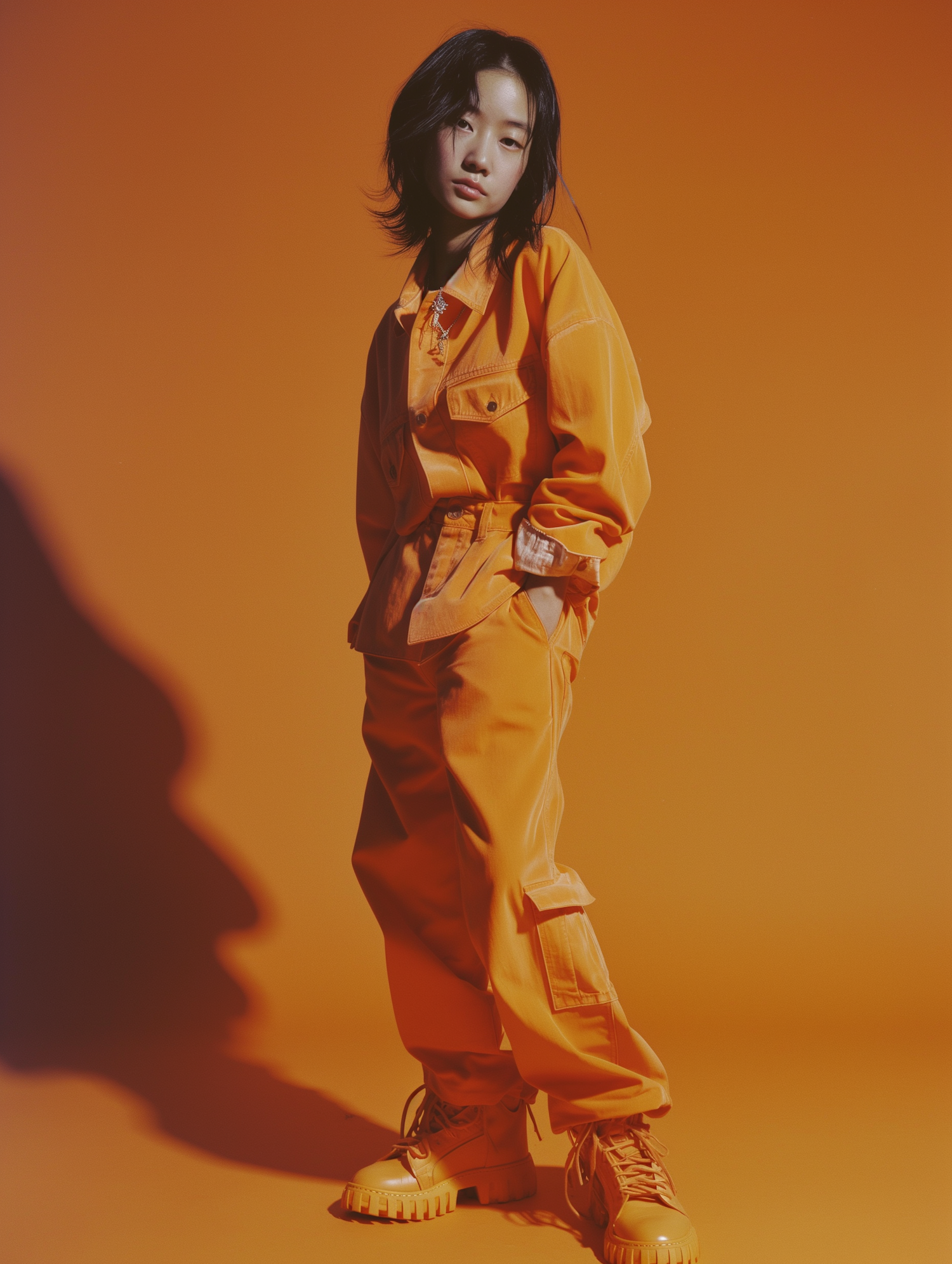 Asian girl in orange outfit poses confidently against a vibrant orange background, creating a striking monochromatic look.