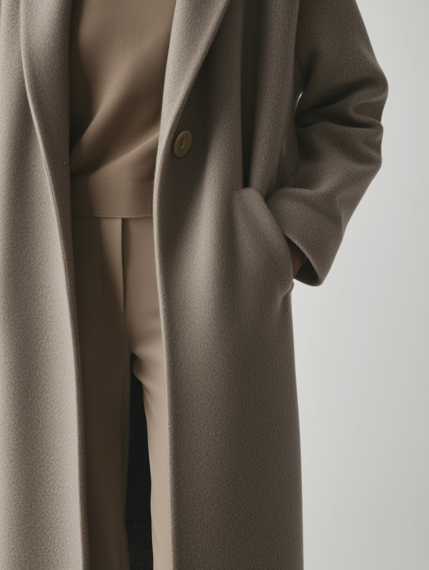 Elegant olive wool coat with matching sweater and pants, featuring a single button and wide lapel for a chic monochromatic look.
