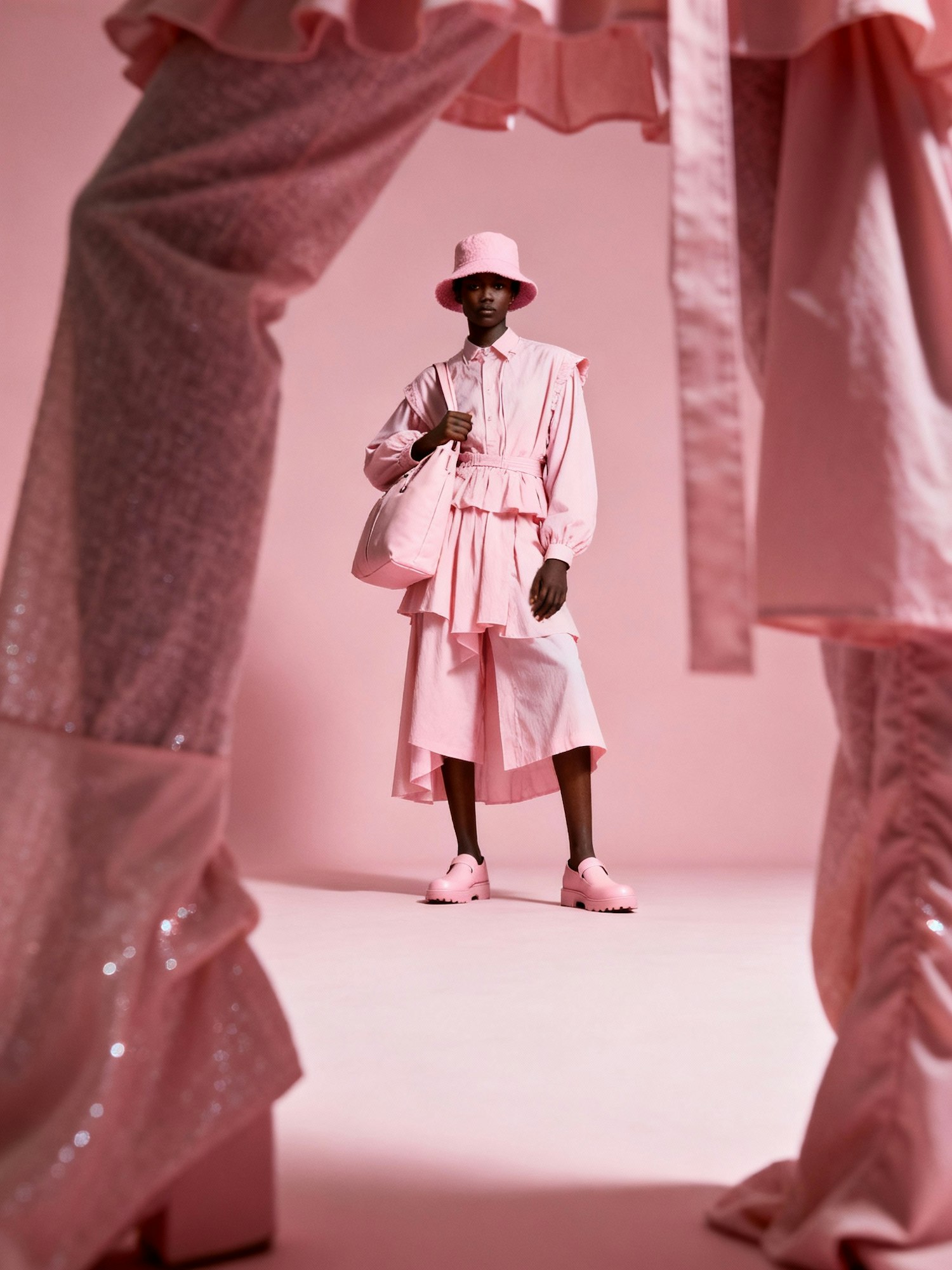 A stylish individual in a pink outfit and accessories, framed creatively with pink fabric, against a soft pink background.